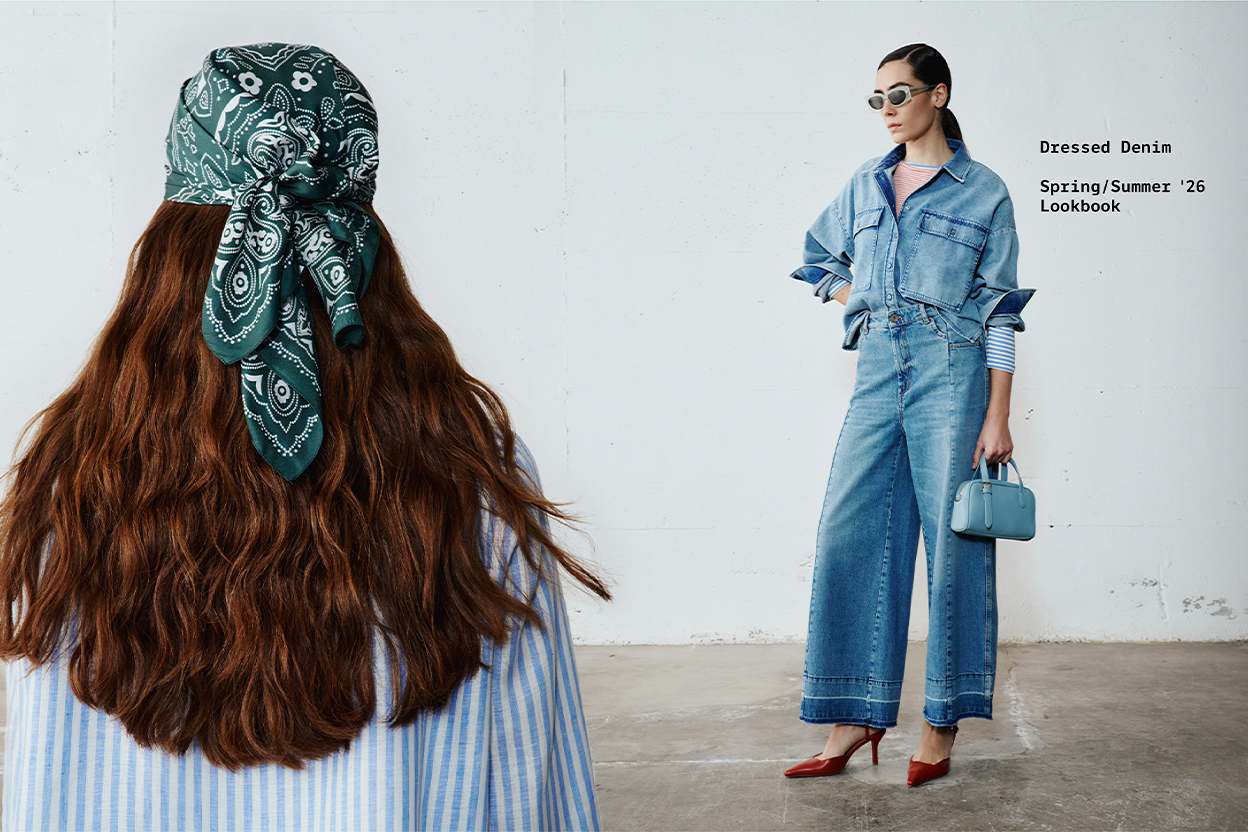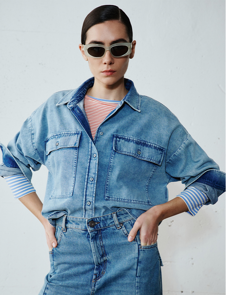 Discover the contrast between the palest wash and deep blue, with boxy jackets and midi skirts featuring a front slit. Layering and texture for a bold look.