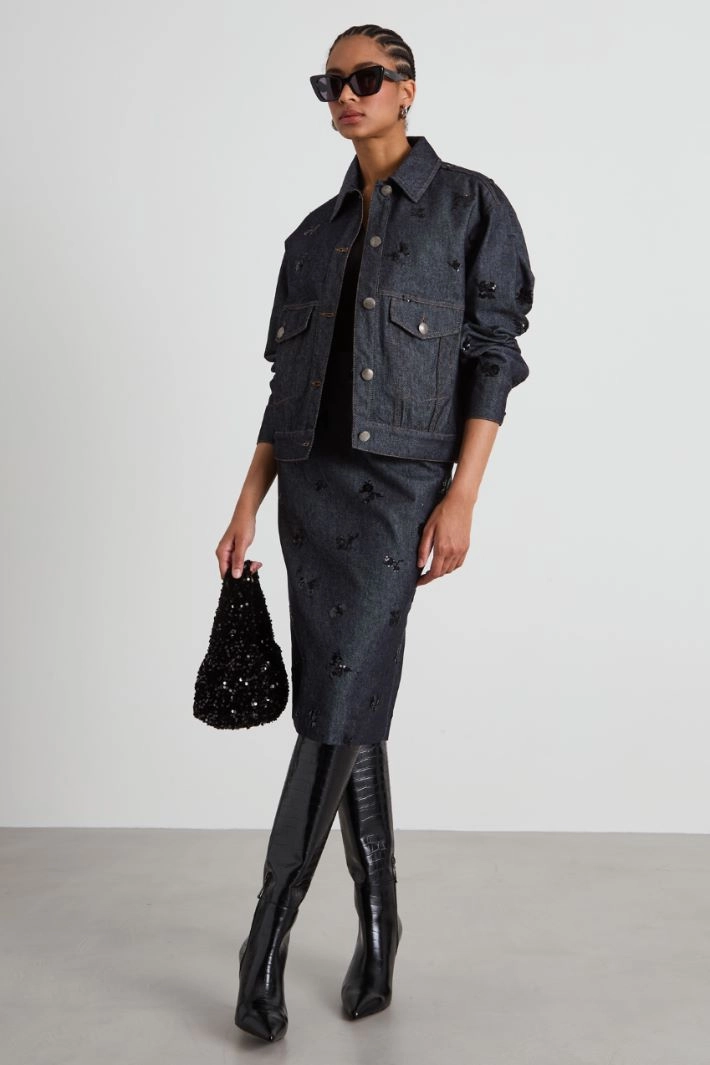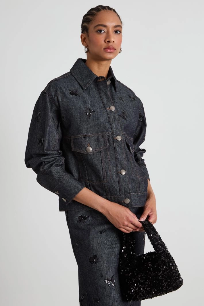 Straight-fit jacket in pure cotton denim, with embroidered rhinestone motif, shirt collar, buttoned flap pockets on the chest and long sleeves with buttons. Fastening with metal buttons.