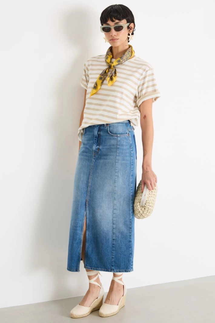 A denim skirt in a slightly flared cut, featuring French pockets on the front, patch pockets on the back, vertical seam detailing and a back slit. Button and zip fastening.