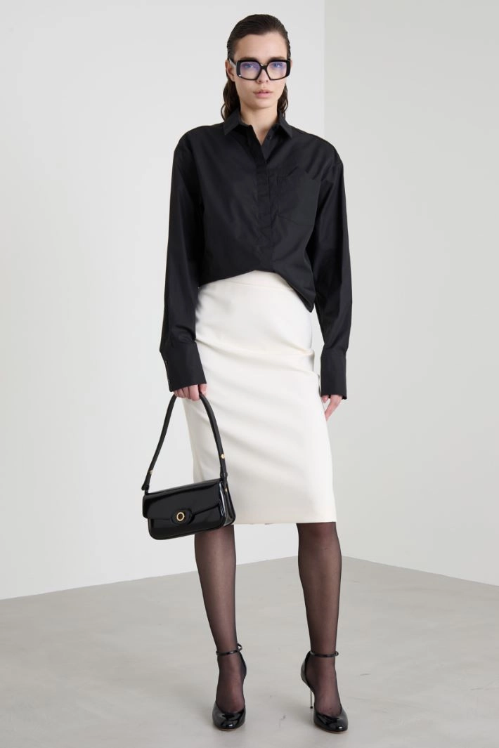 Pencil skirt in fluid stretch cady, with central slit and fastening with invisible zip and hook on the back. Lined.