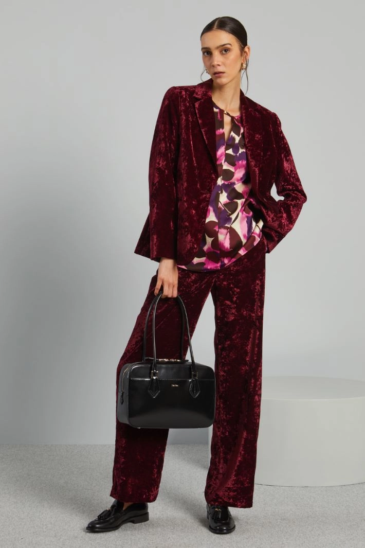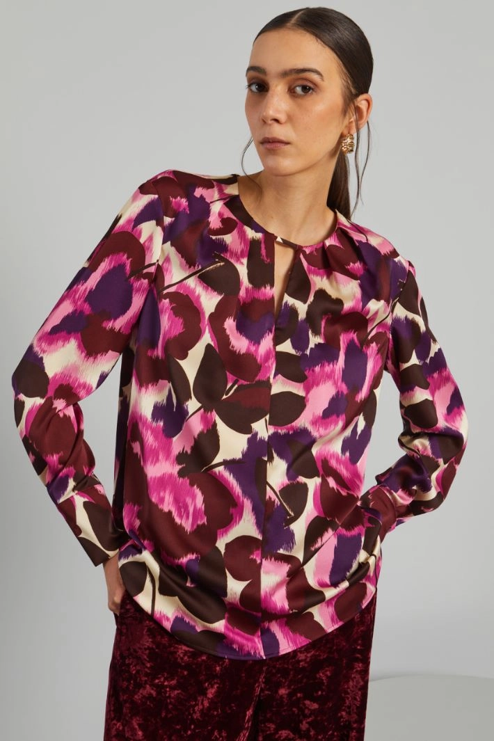 Fluid blouse in printed seersucker satin, with crew neckline finished with stitched pleats, keyhole opening on the front, long sleeves with cuff and button, button fastening on the back.