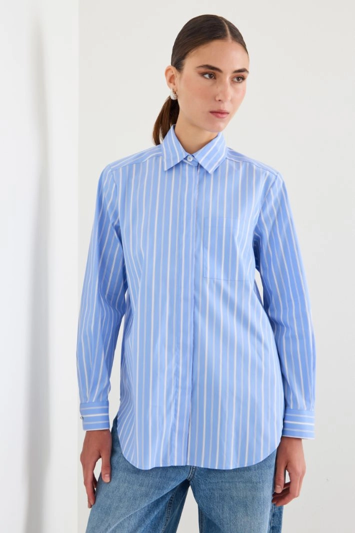 Loose-fit shirt in yarn-dyed cotton blend poplin, with classic collar, long sleeves with cuffs and buttons, chest pocket and side slits with asymmetrical hem. Hidden button fastening.