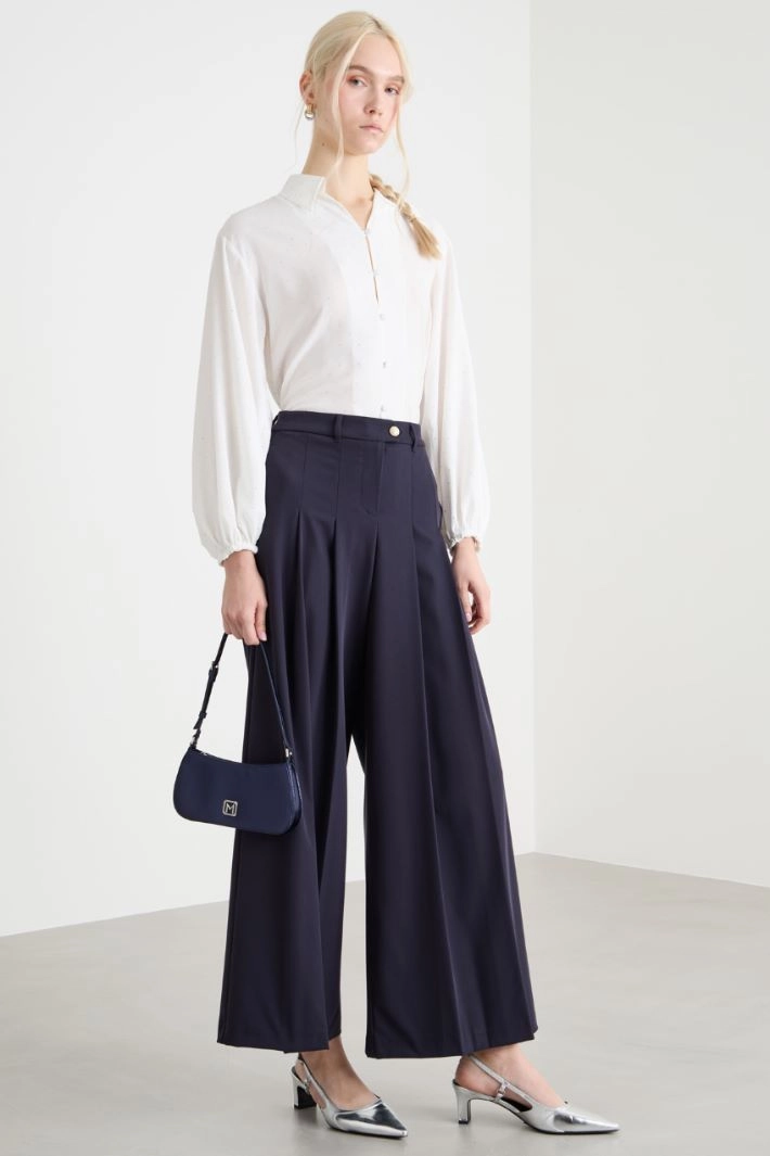 Wide-leg trousers crafted in technical twill, featuring belt loops, front pleats, side seam pockets and welt pockets on the back. Fastening with a button and zip.