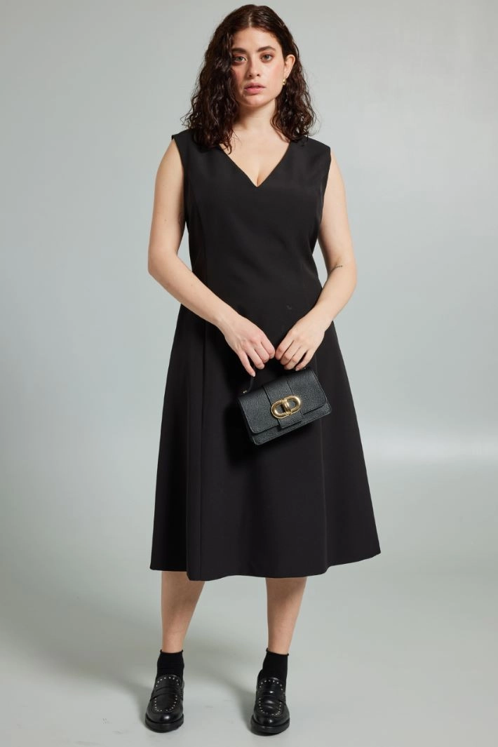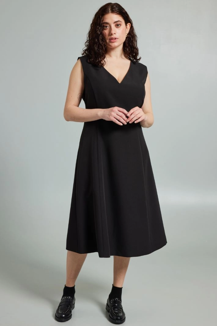 Flared dress in fluid stretch fabric, with V-neck, sleeveless and invisible zip fastening on the back. Lined.