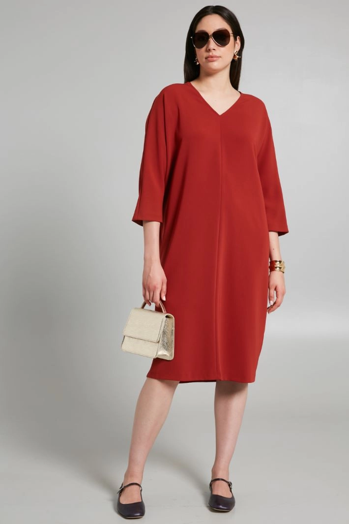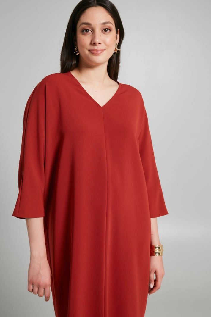 Egg-shaped cady dress with V-neck, three-quarter kimono sleeves and invisible zip fastening on the back.