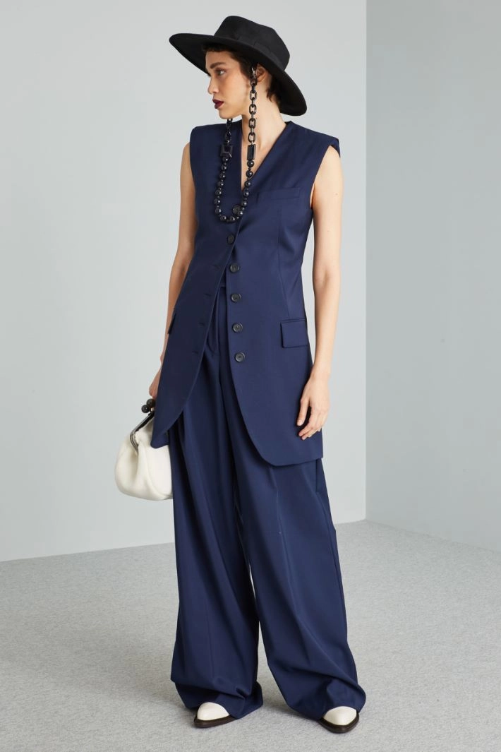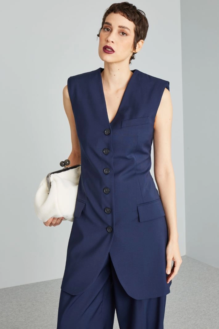 Long slim fit vest in pure wool canvas, with twill inserts, V-neck, padded shoulder straps, welt pocket and double welt pockets with flap, strap and vent in the back. Single-breasted button fastening. Lined.