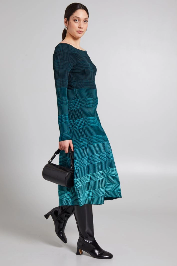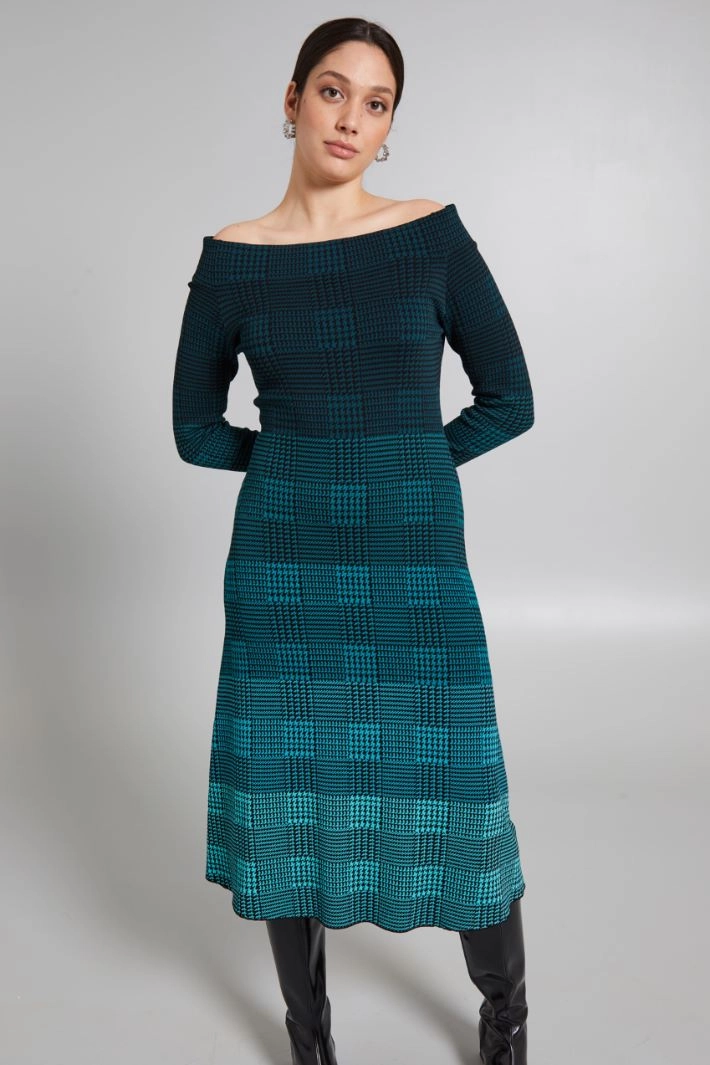Semi-fitted dress in viscose blend jacquard knit, with off-the-shoulder neckline and long raglan sleeves.