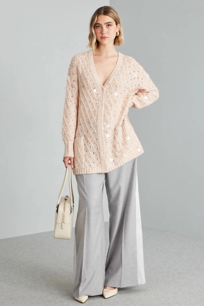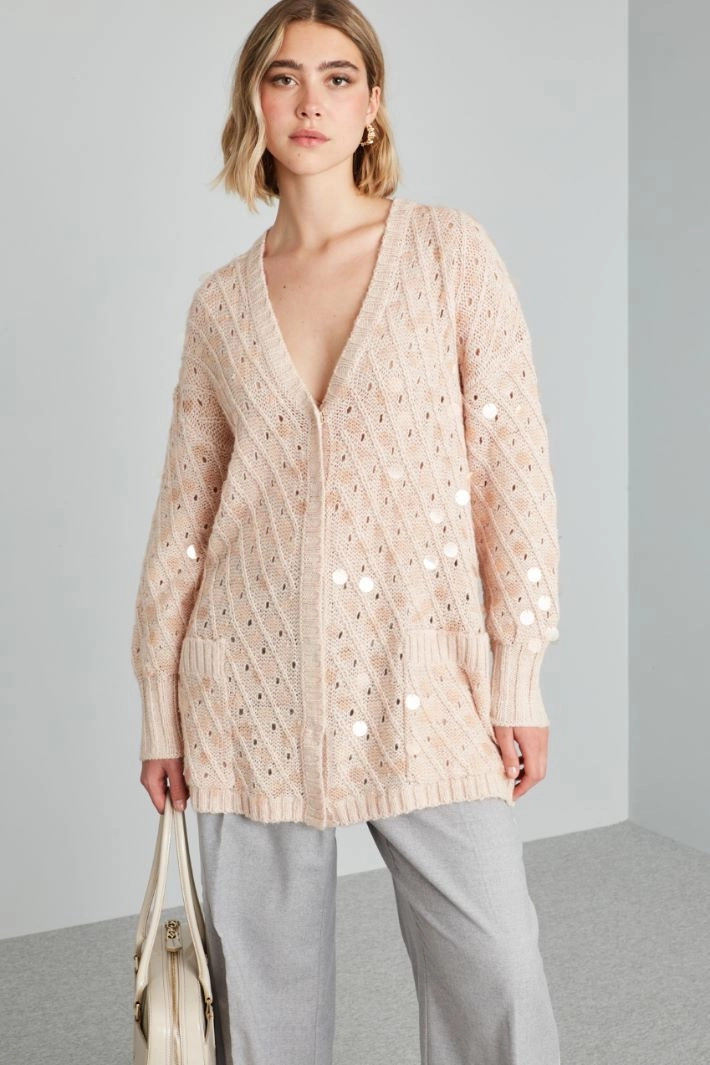 Long, loose fit cardigan in wool blend yarn, with diagonal ribbing, maxi sequins embroidered in tone, V-neck, long sleeves with dropped cuffs, side patch pockets and hidden fastening with snap buttons.