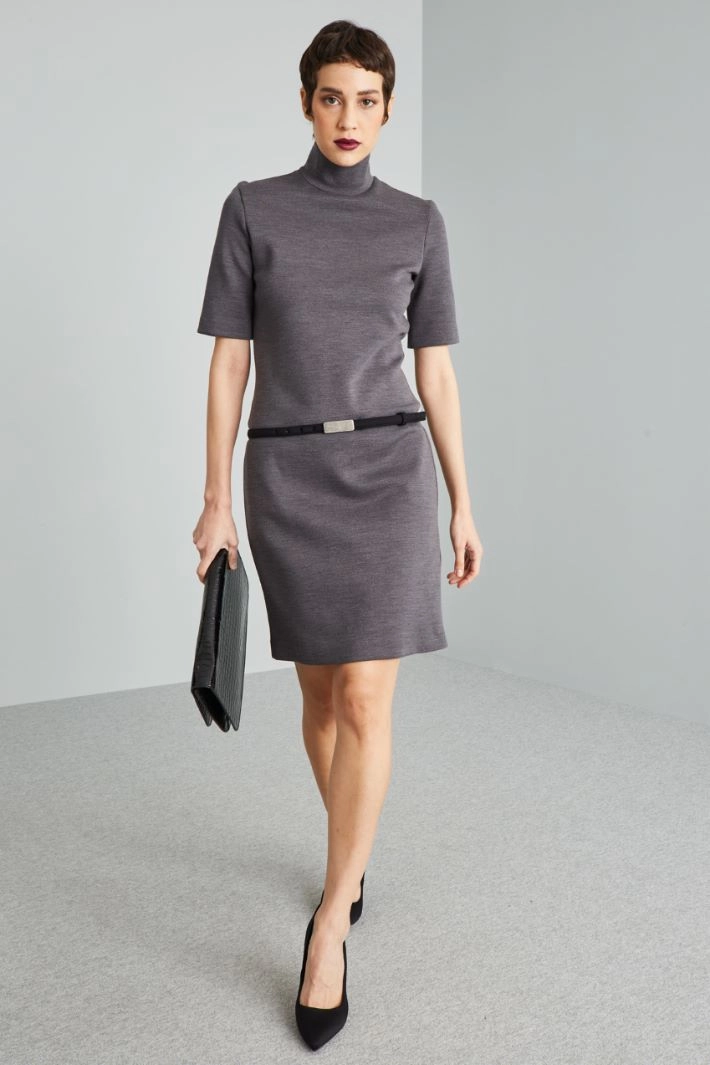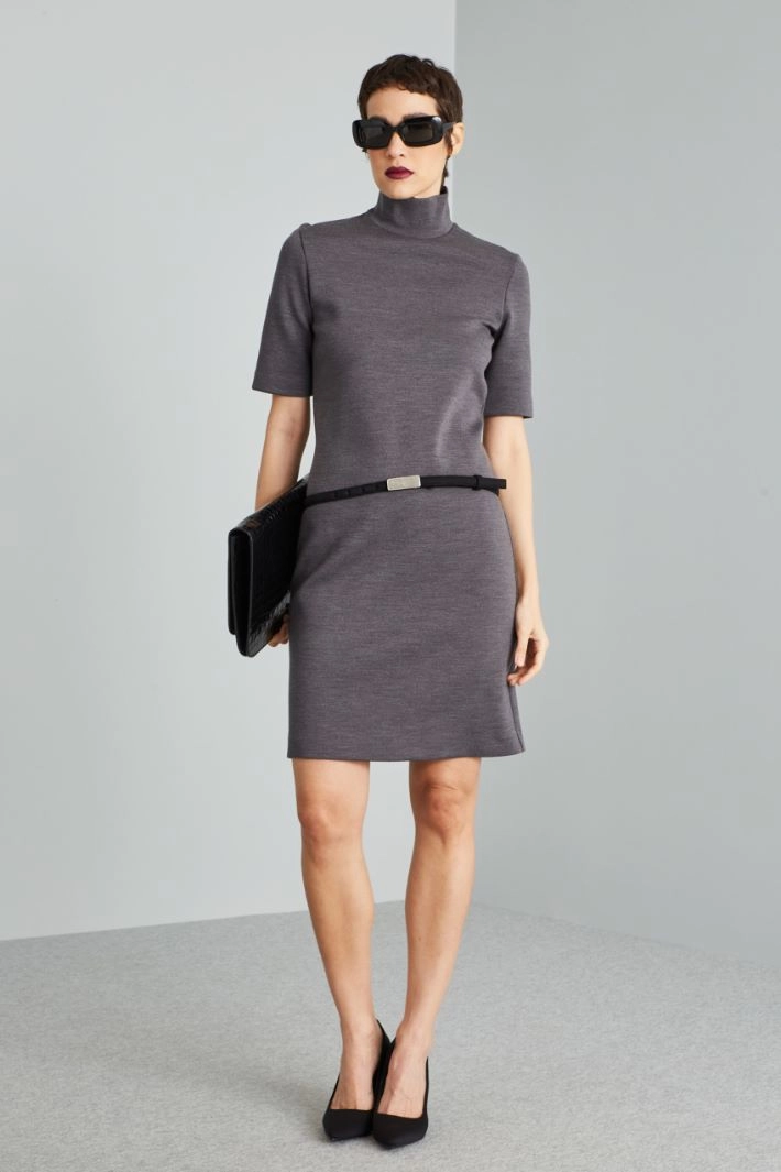 Short dress with a regular fit in stretch wool jersey, with a high neck and short sleeves. Invisible zip fastening on the back. Matching belt.