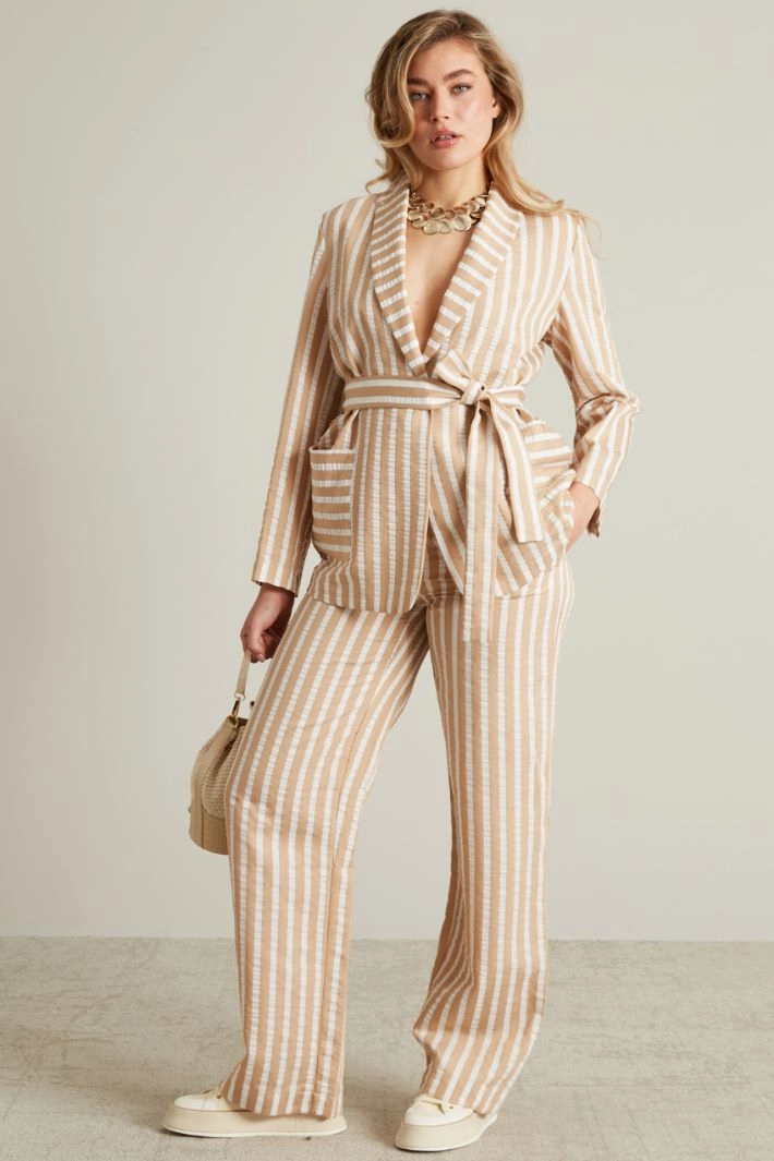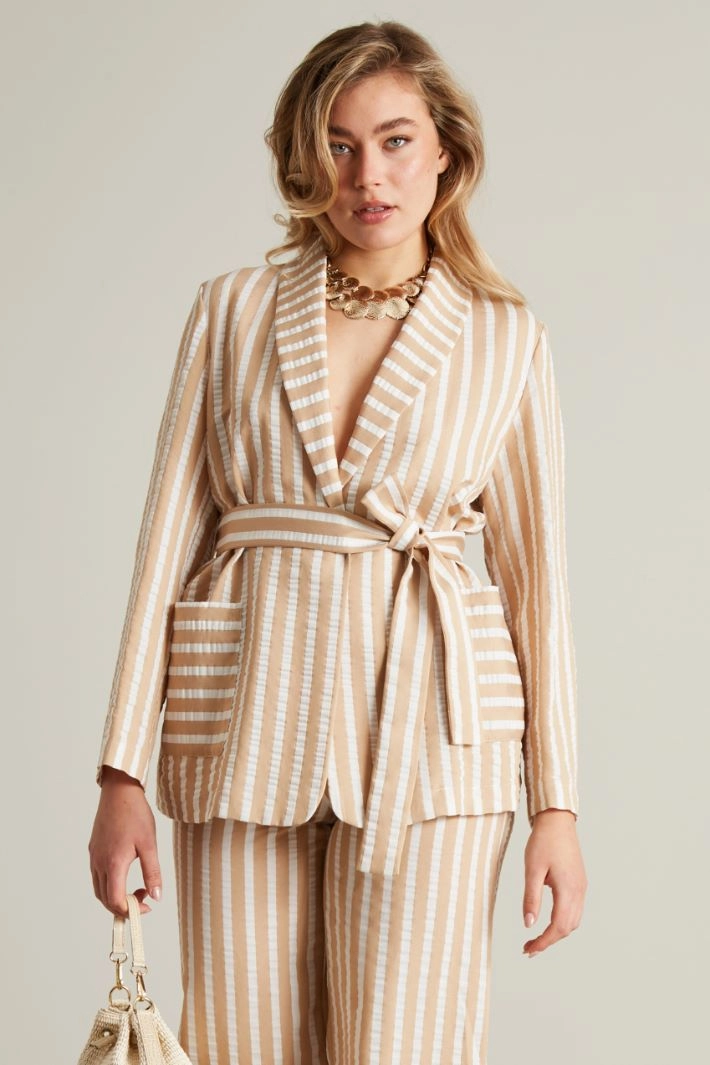 Straight-fit blazer in jacquard viscose, with lapel collar and long sleeves. Patch pockets. Single-breasted fastening with button and matching belt.