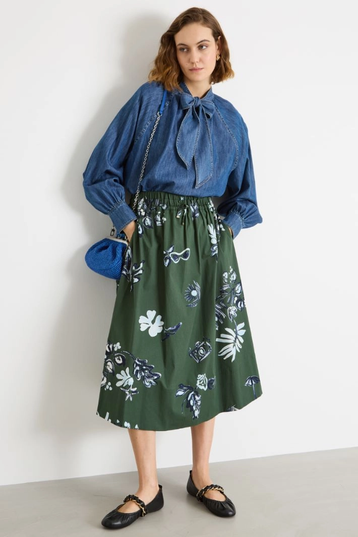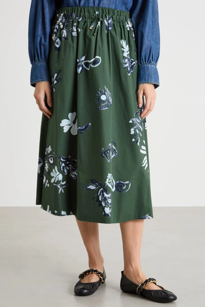 A-line midi skirt crafted in stretch cotton poplin, with an elasticated drawstring waist and a deep topstitched hem.