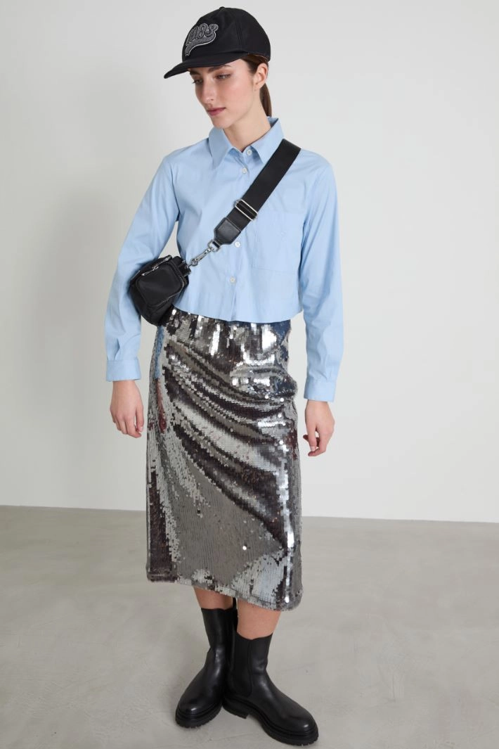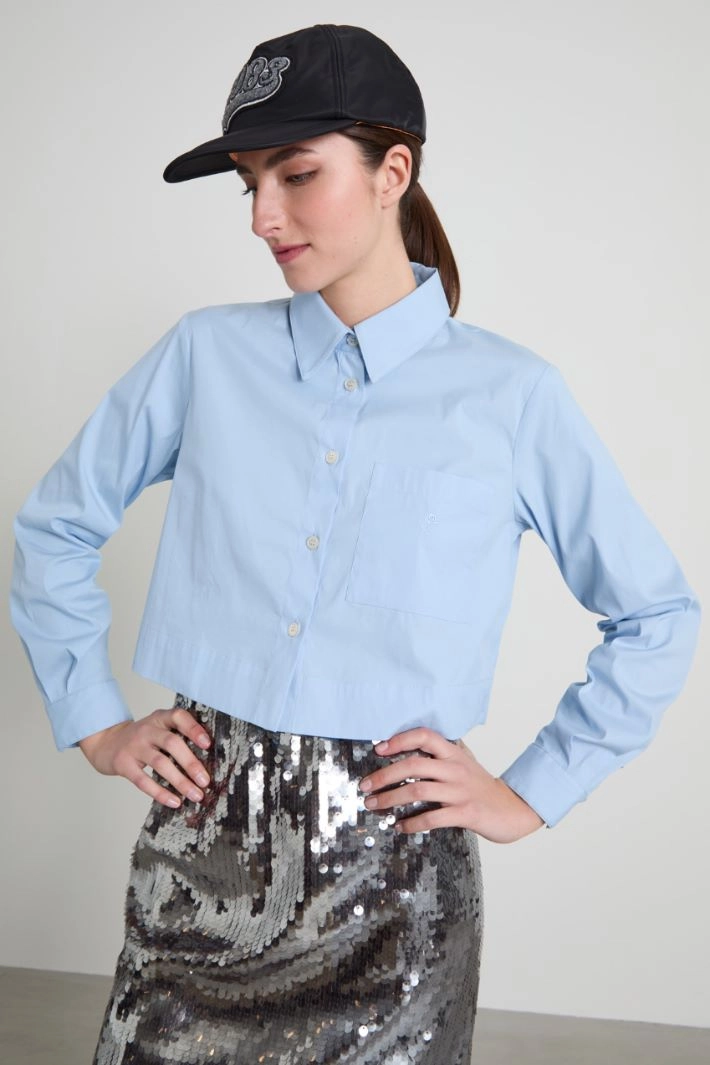 Straight-fit shirt in stretch cotton-blend poplin, featuring a classic collar, embroidered chest pocket, long sleeves with buttoned cuffs, and a pleated yoke. Button fastening.