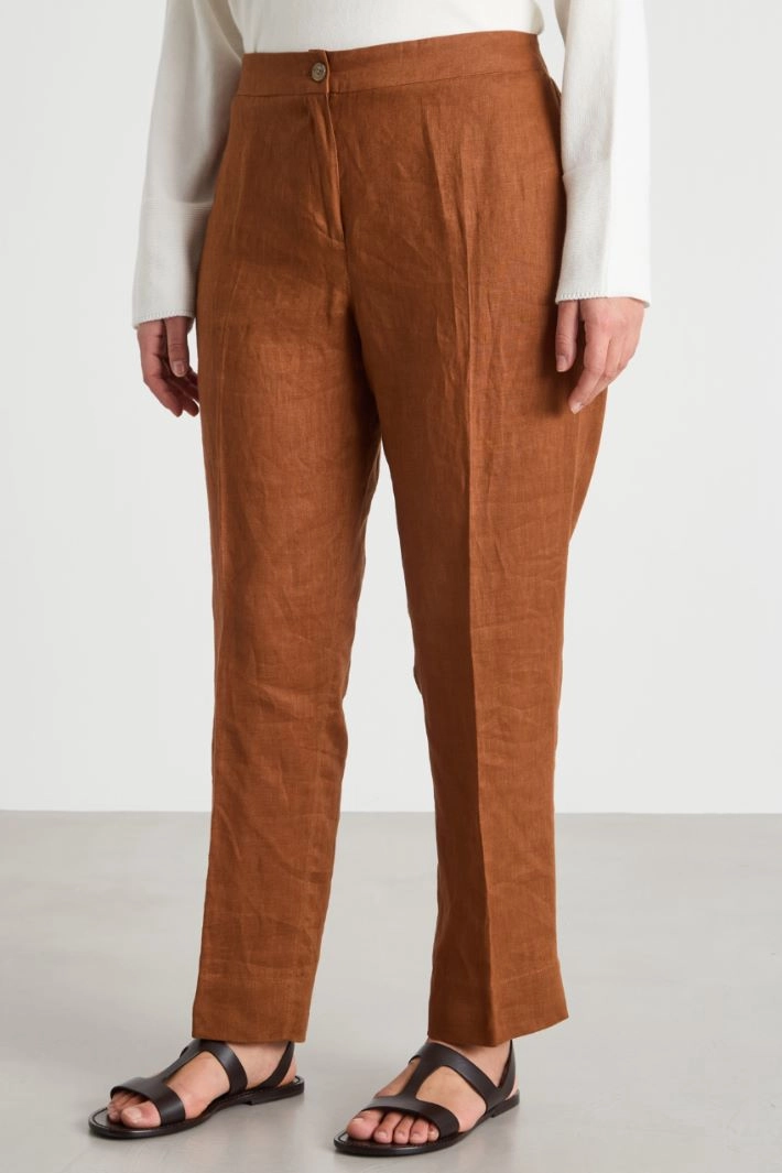 Cigarette trousers crafted in pure linen, featuring an elasticated back waistband and slits at the hem. Zip and button fastening.