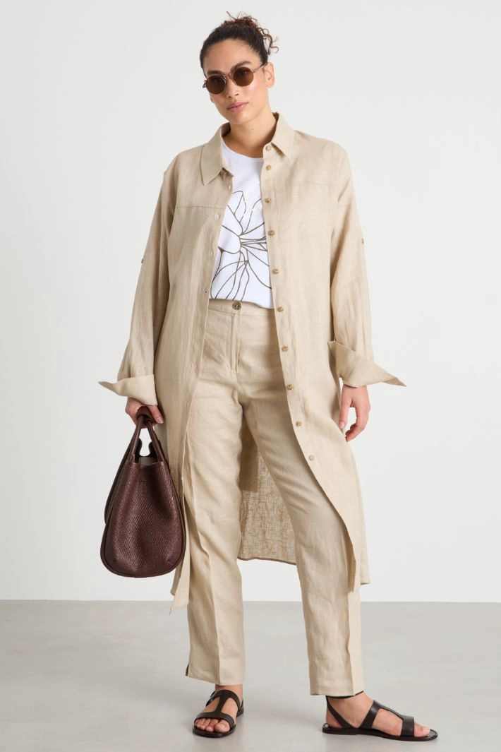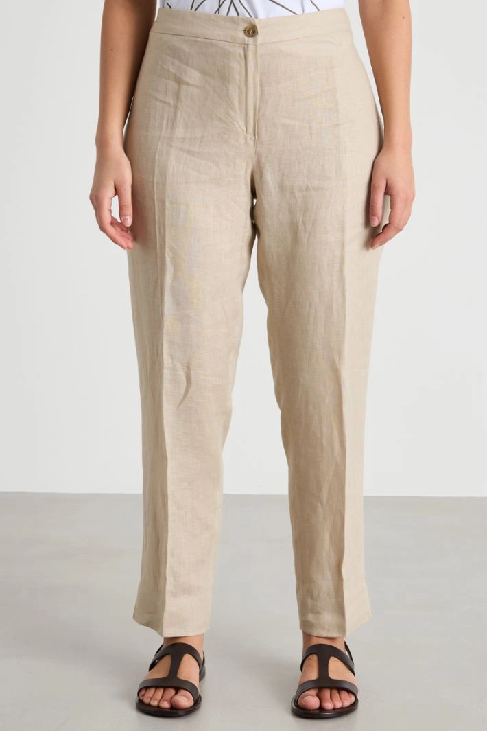 Cigarette trousers crafted in pure linen, featuring an elasticated back waistband and slits at the hem. Zip and button fastening.