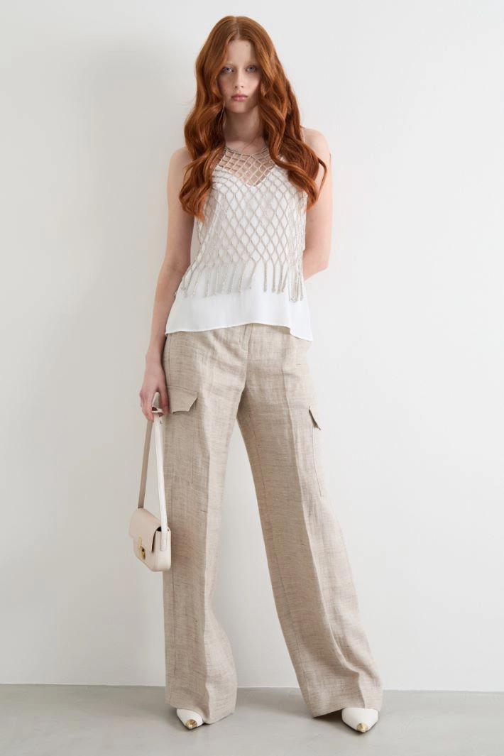 Straight-fit cargo trousers in pure linen, featuring belt loops, front French pockets, rear welt pockets and patch pockets on the leg. Fastening with a button and concealed zip.