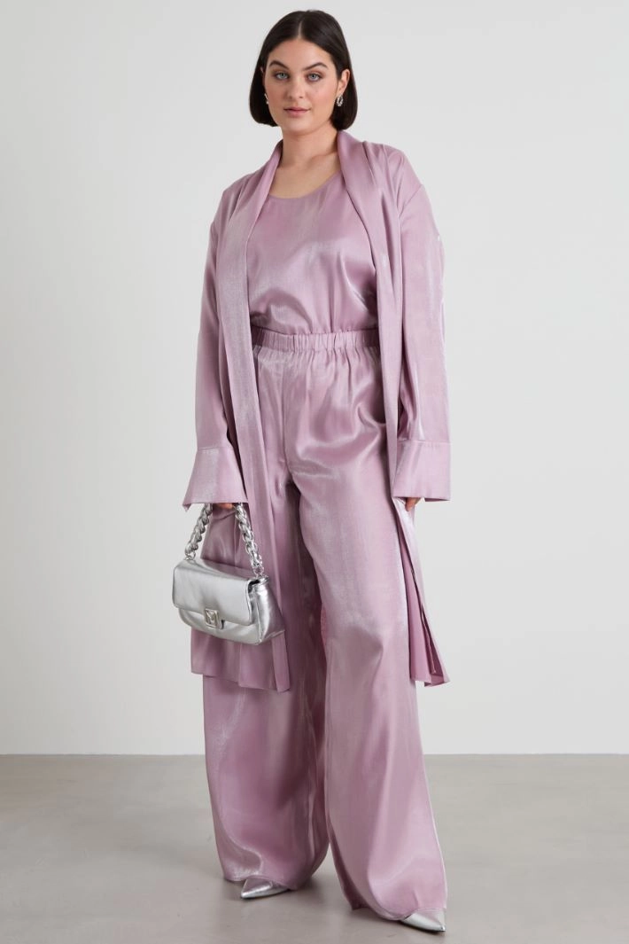 Straight-cut trousers in lamé viscose blend canvas, with elasticated waistband and side slits at the bottom.