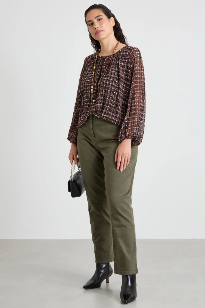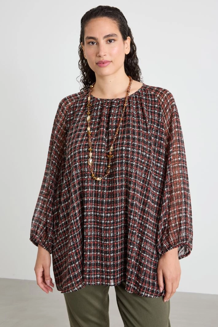 Flowing blouse in printed georgette, with crew neck, long raglan sleeves with elastic insert and teardrop fastening with button on the back. Semi-lined.