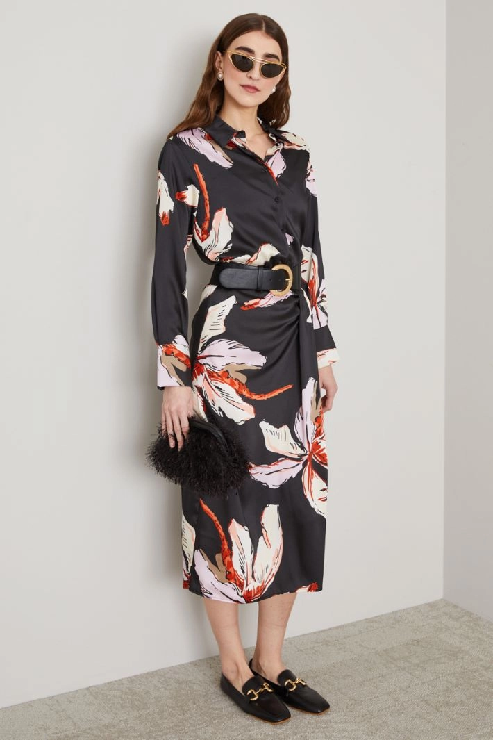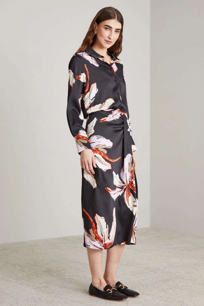 Flowing shirt dress in all-over printed twill, with classic collar and button opening on the front, long sleeves with cuff and button, elastic waistband and side slit. Invisible zip fastening on the side.