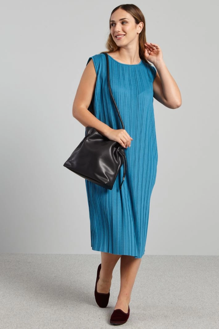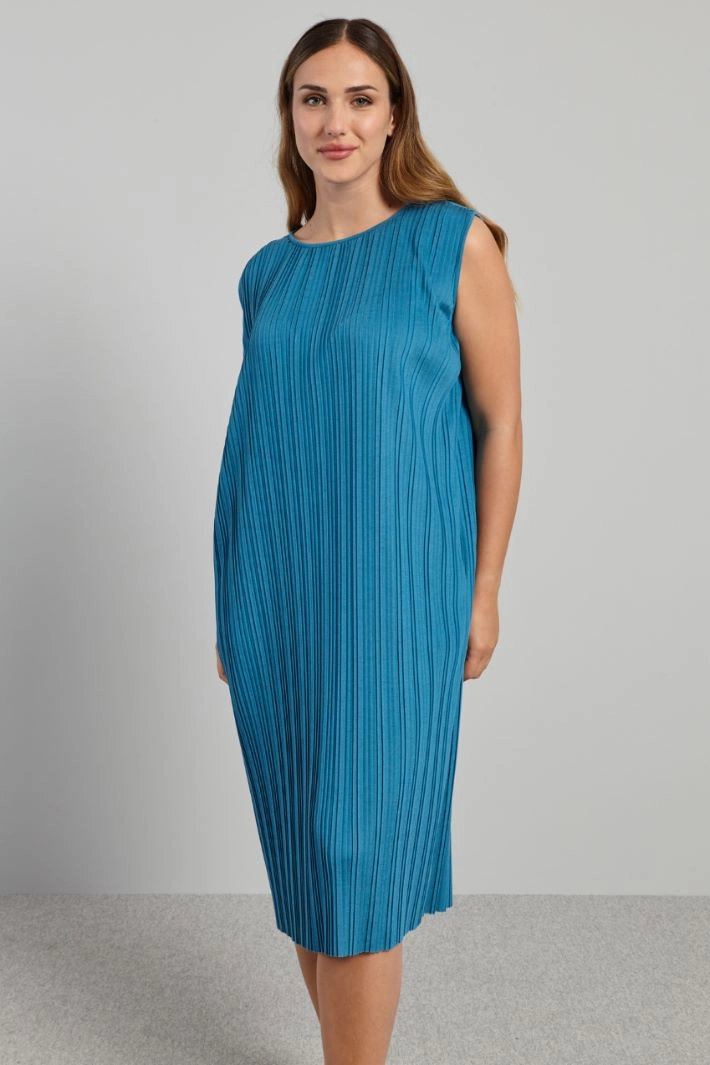 Tunic dress in pleated technical jersey, with boat neckline, sleeveless and inset side pockets. Lined.