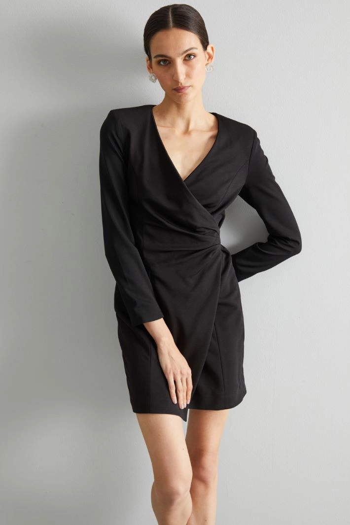 Short sheath dress in stretch viscose blend crepe jersey, with V-neck, long sleeves with slit, single double-welt pocket with flap and wraparound crossover motif on the front. Invisible zip fastening on the back. Lined garment.