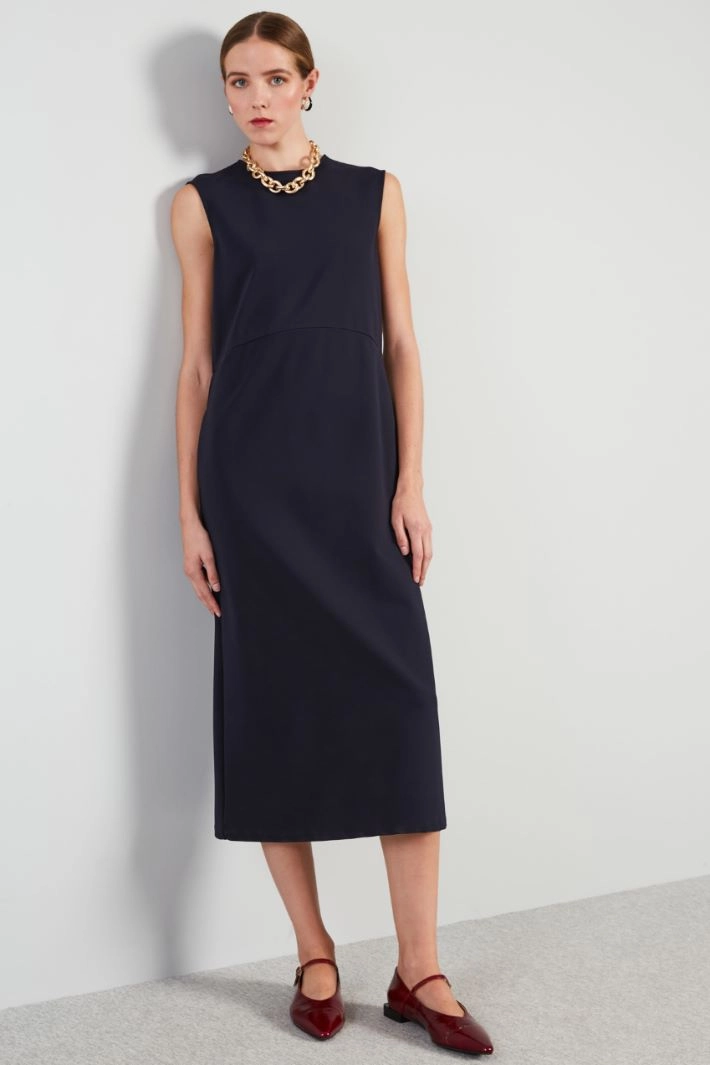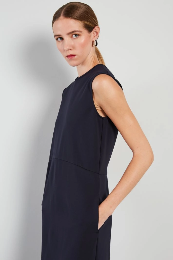 Midi sheath dress in stretch viscose blend crepe jersey, with crew neck, sleeveless, inset side pockets and invisible zip fastening on the back.