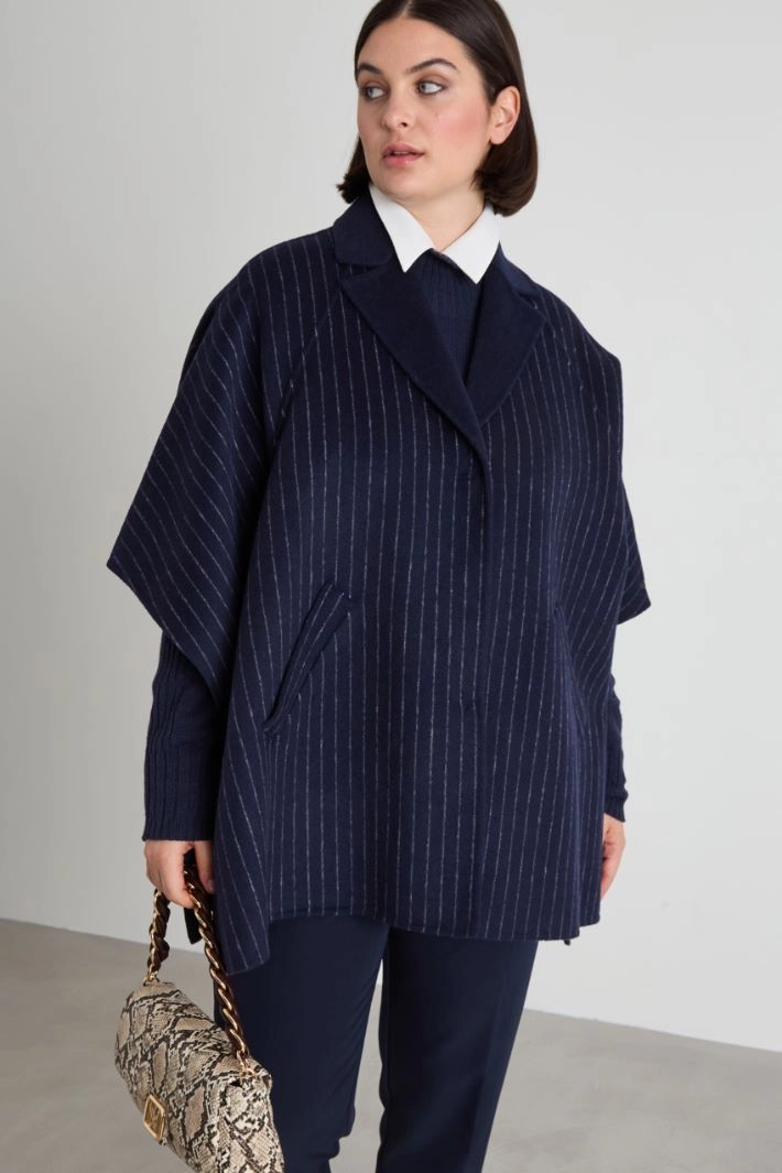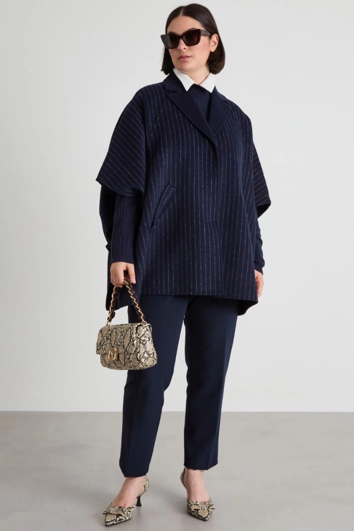 Wide-cut cape in double wool blend fabric, with lapel collar, welt pockets and buttoned toggles on the sides. Fastening with automatic buttons.