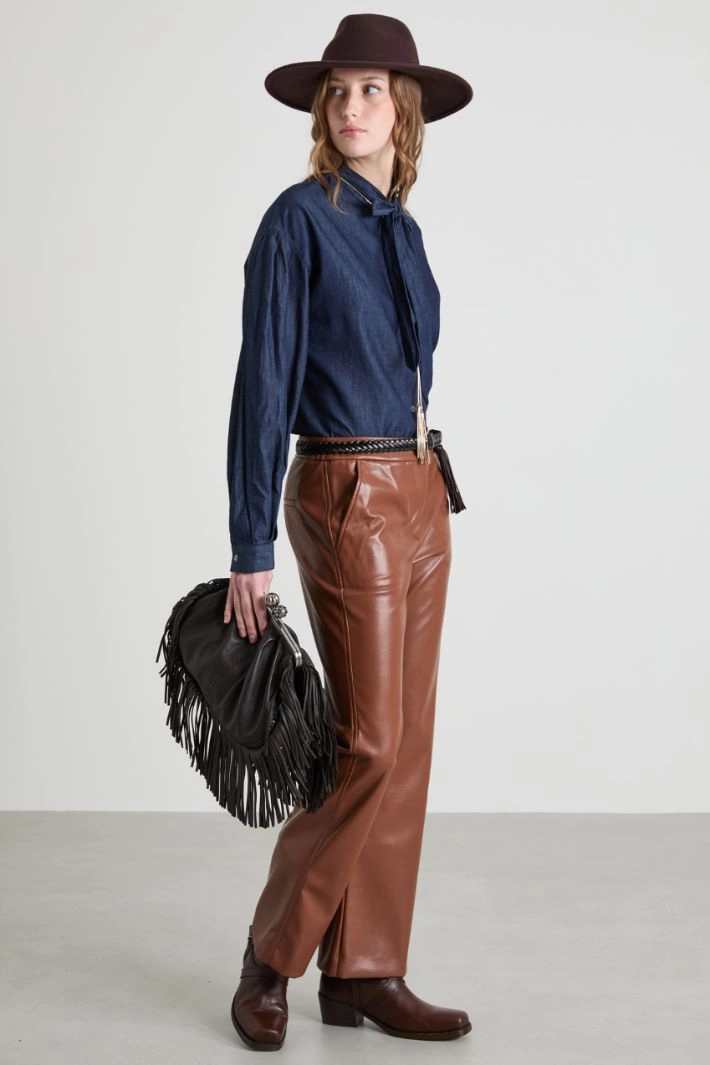Straight-cut faux leather trousers with French pockets on the front and welt pockets on the back. Fastening with a hidden zip and button.