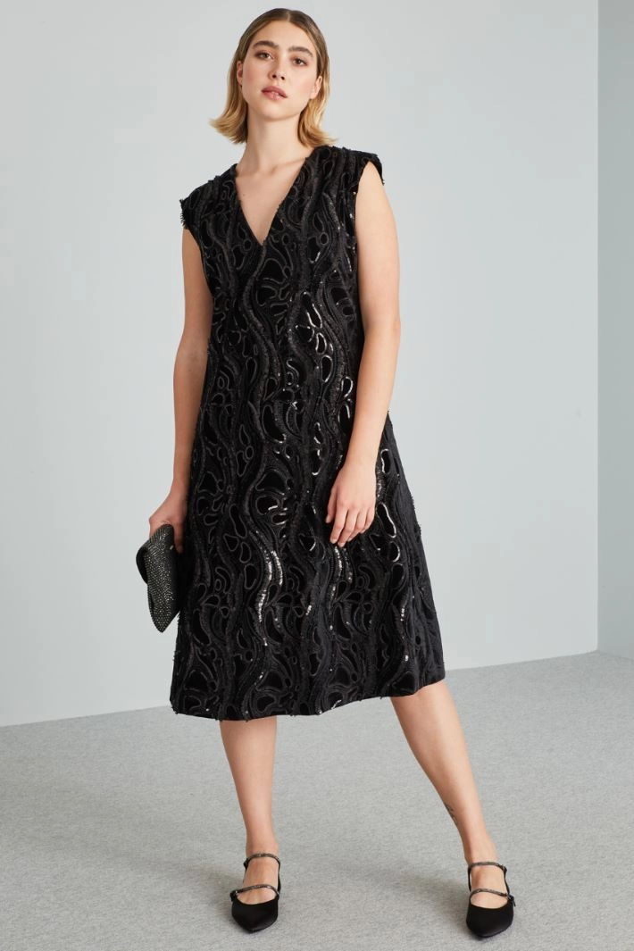 Flared dress in stretch velvet, with all-over embroidered micro sequins, V-neck, sleeveless and invisible zip fastening on the back. Lined.