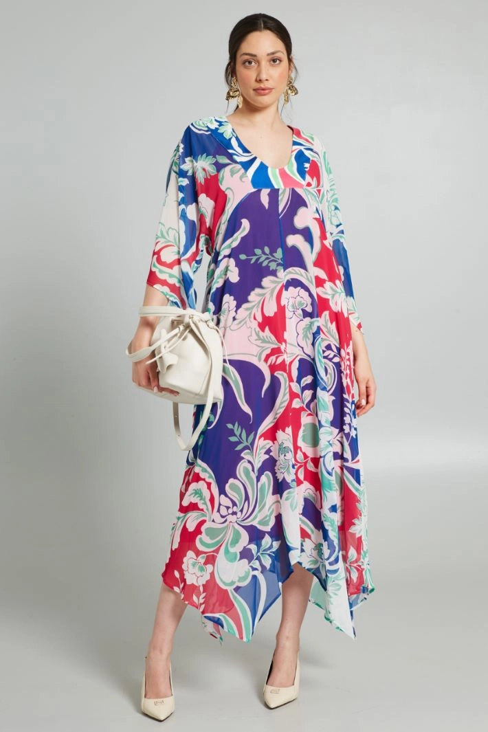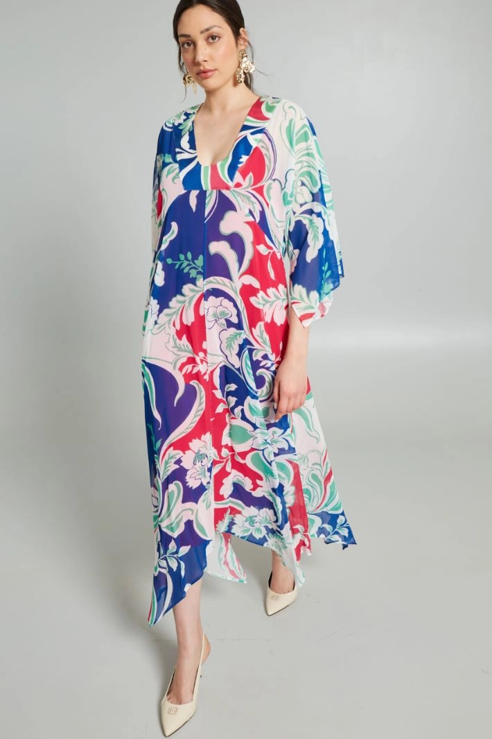 A-line dress in printed georgette, with kimono neckline and sleeves with slits. Invisible zip fastening on the back. Matching slip.