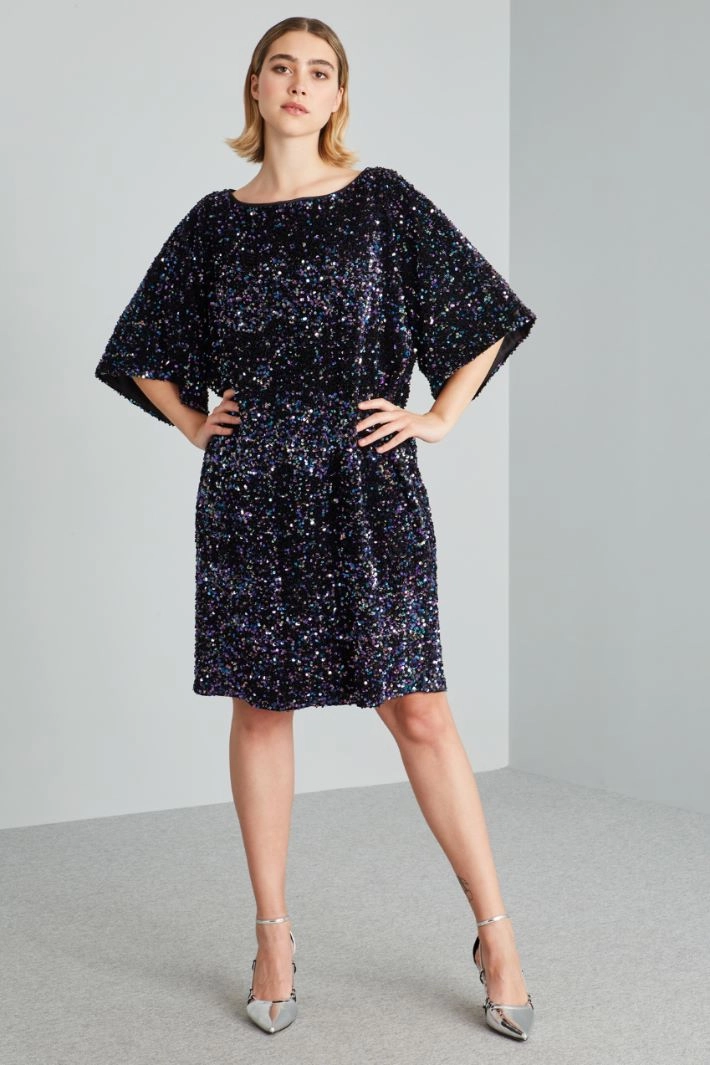 Loose-fitting dress in chenille jersey covered in sequins, with boat neckline and three-quarter kimono sleeves. Partially-lined.