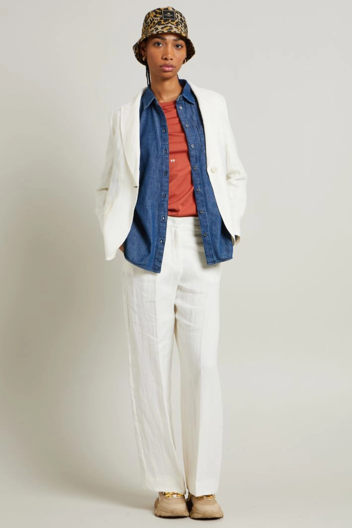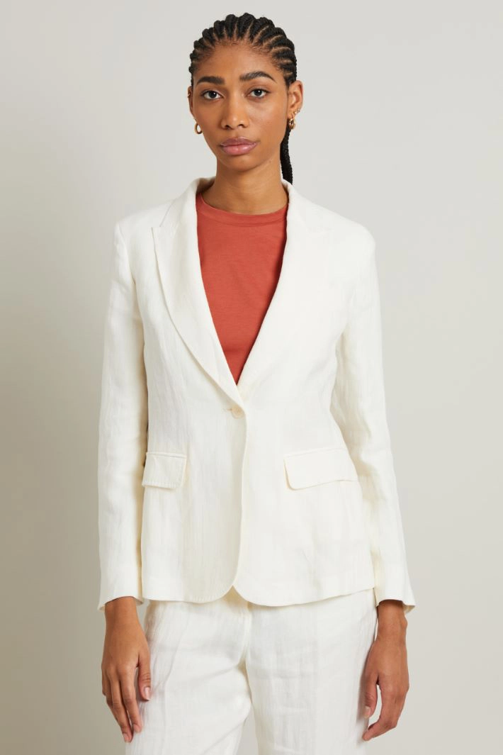 Slightly fitted blazer in pure linen canvas, with lapel collar, long sleeves, double welt side pockets with flap and central vent on the back. Single-breasted fastening with single button. Partially-lined.