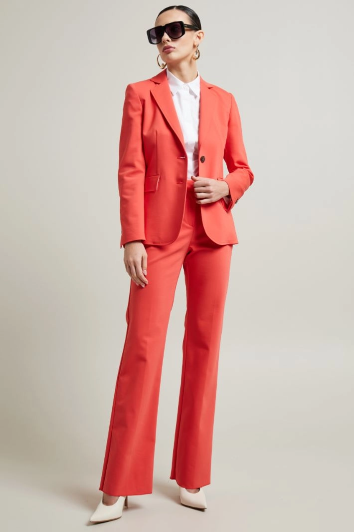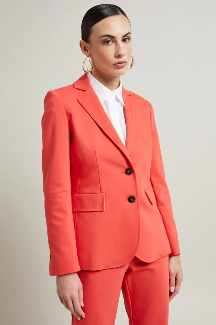 Fitted blazer in stretch cotton blend fabric, with lapel collar, long sleeves with button, side welt pockets with flap and single-breasted fastening with buttons. Lined.