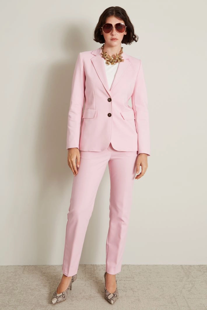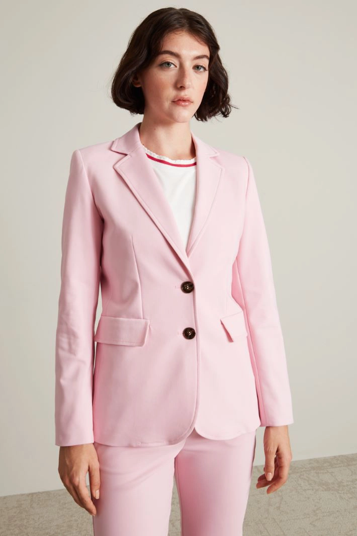 Fitted blazer in stretch cotton blend fabric, with lapel collar, long sleeves with button, side welt pockets with flap and single-breasted fastening with buttons. Lined.
