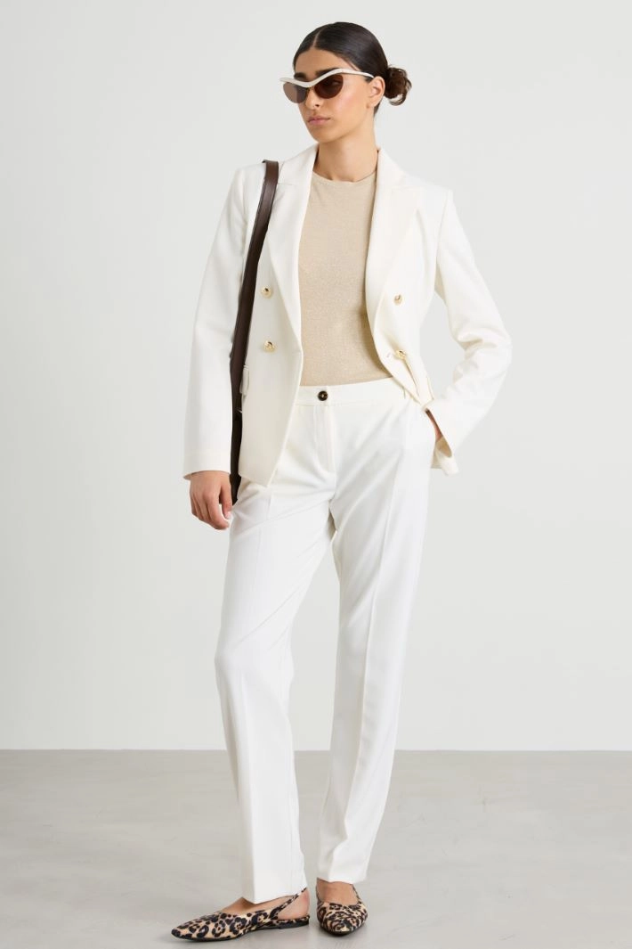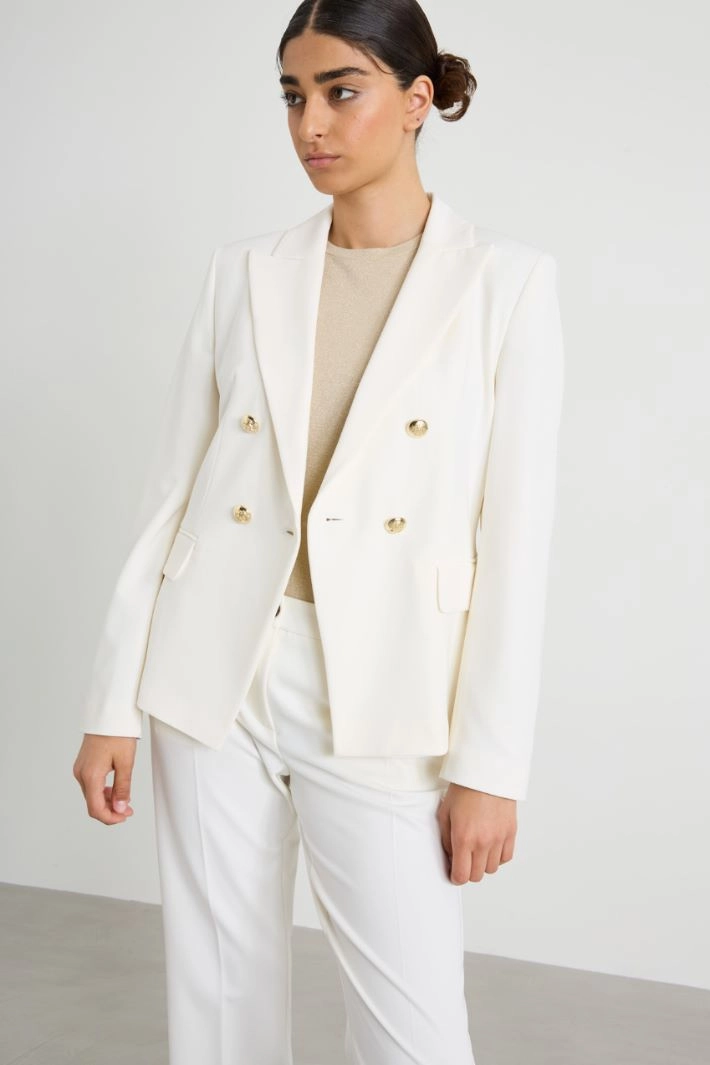 Fitted blazer in stretch fabric, with lapel collar, long sleeves, flap pockets and double-breasted button fastening. Lined.