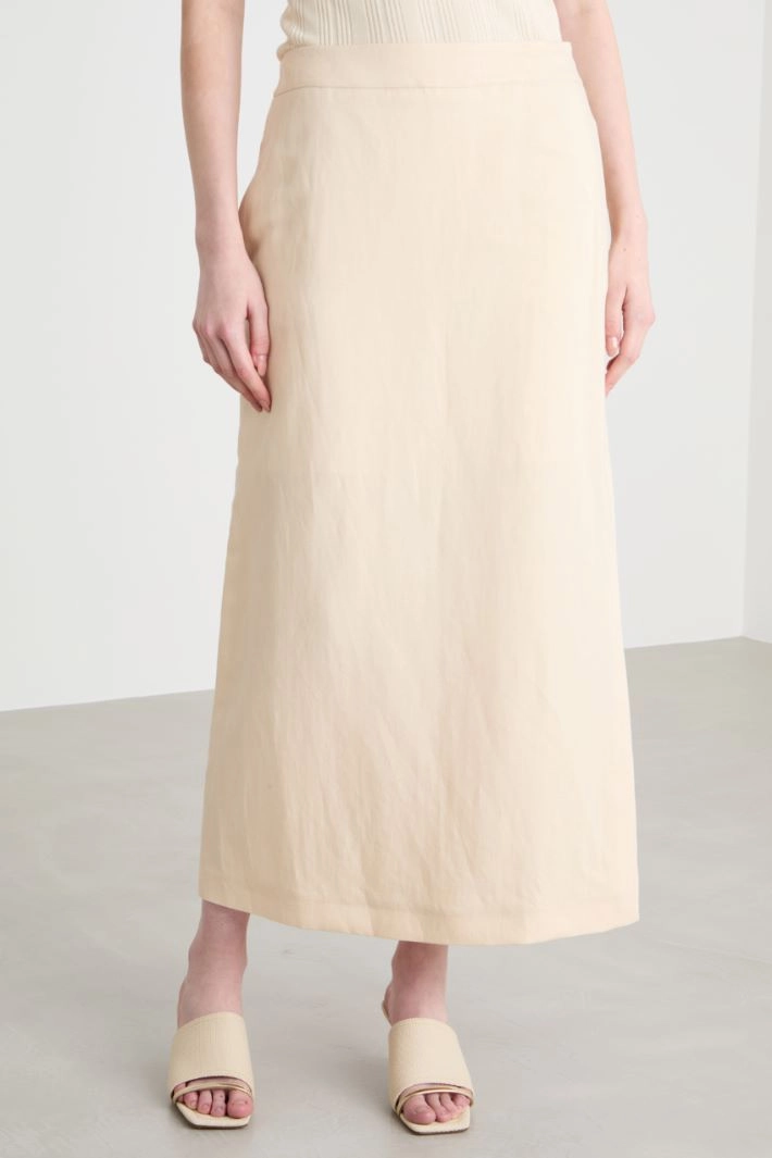 Long skirt crafted in viscose and linen canvas. This partially lined piece features in-seam pockets, buttoned welt pockets on the back and a side slit at the hem. Zip fastening at the back.