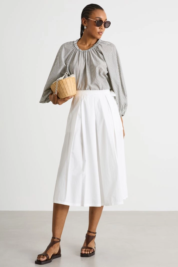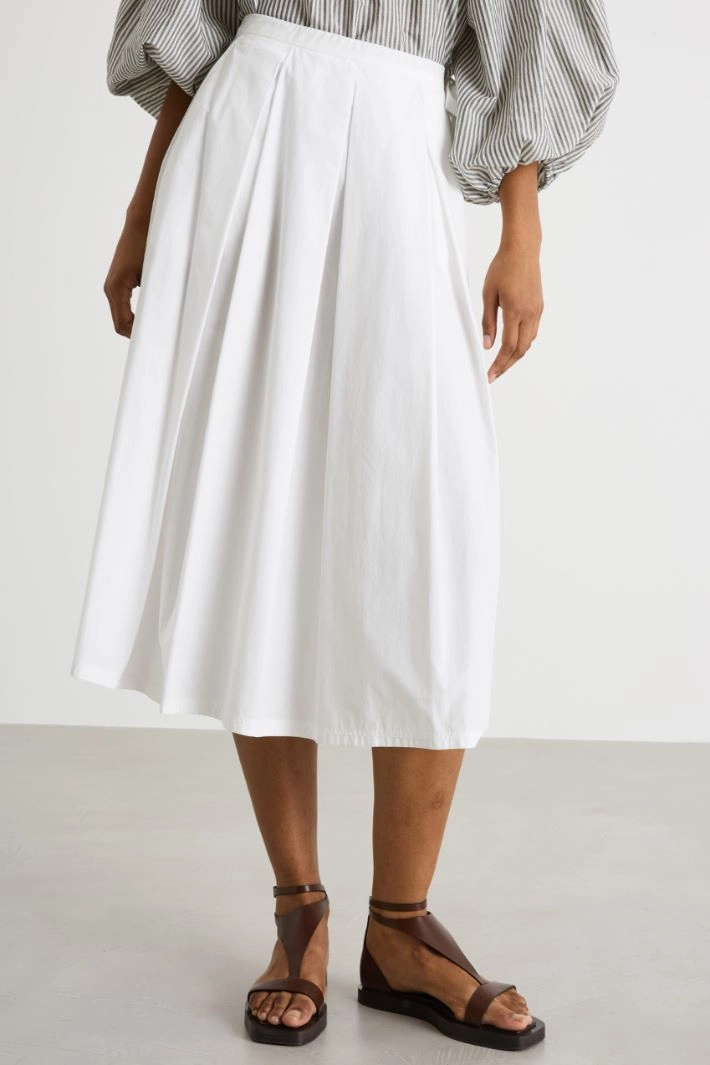 A-line midi skirt in pure cotton poplin, featuring front pleats, an elasticated waist gathered at the back, and French pockets. Unlined. Fastening with a side zip and a self-tie detail at the waist.