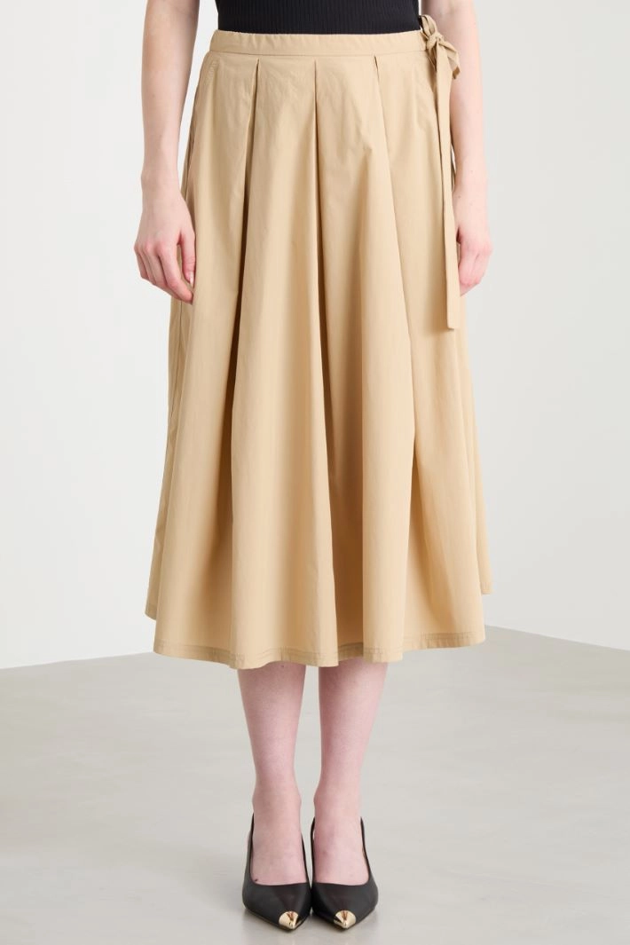 A-line midi skirt in pure cotton poplin, featuring front pleats, an elasticated waist gathered at the back, and French pockets. Unlined. Fastening with a side zip and a self-tie detail at the waist.