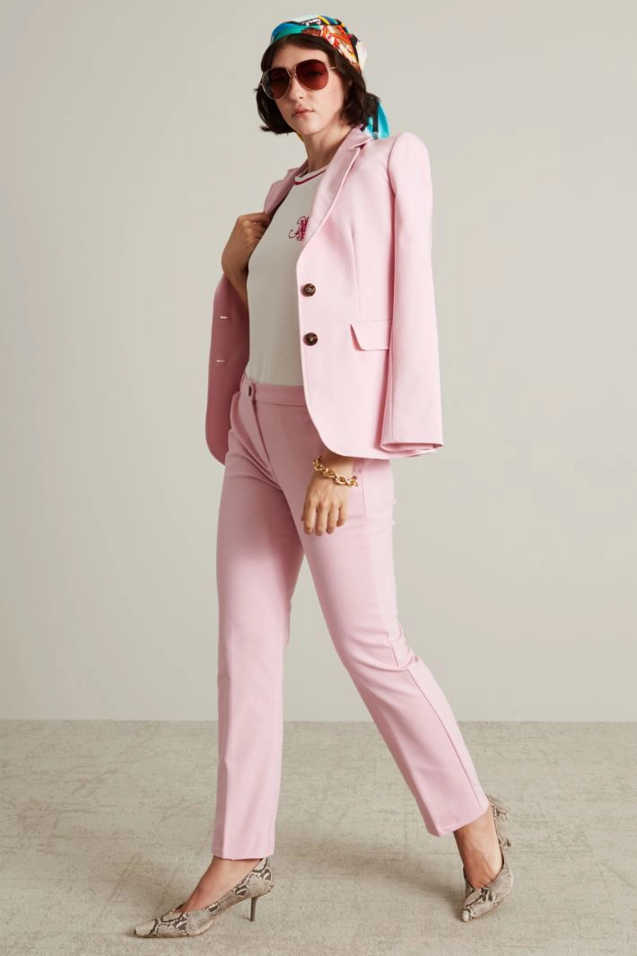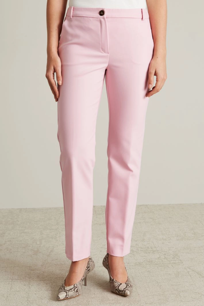 Cigarette trousers in stretch cotton blend fabric, with French side pockets, pressed crease and hidden fastening with hidden zip and button.