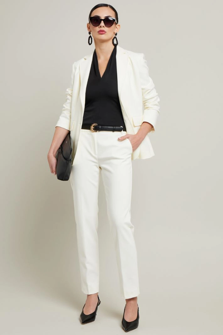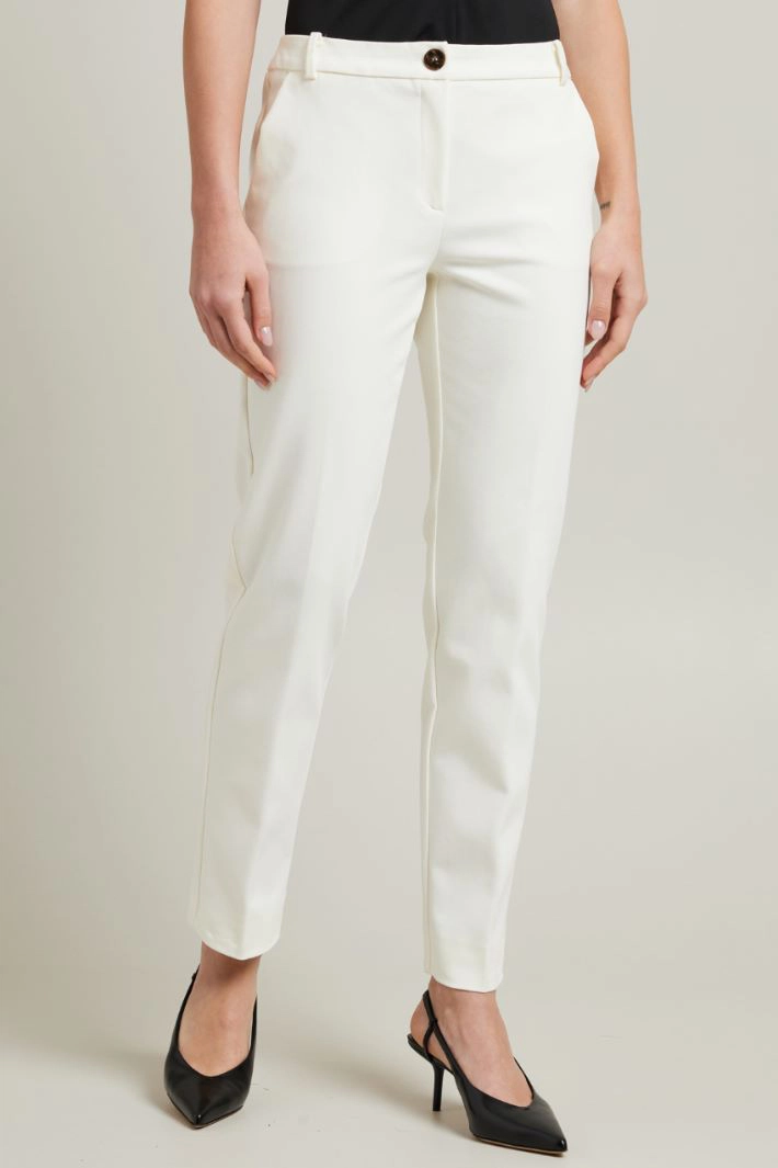 Cigarette trousers in stretch cotton blend fabric, with French side pockets, pressed crease and hidden fastening with hidden zip and button.