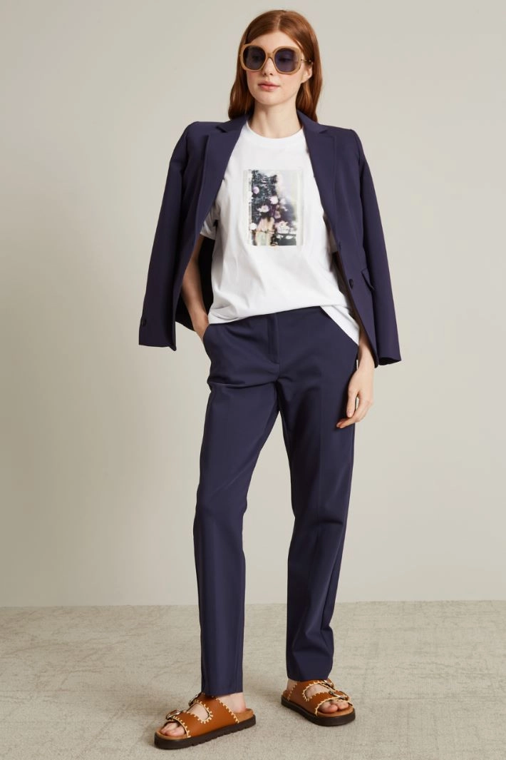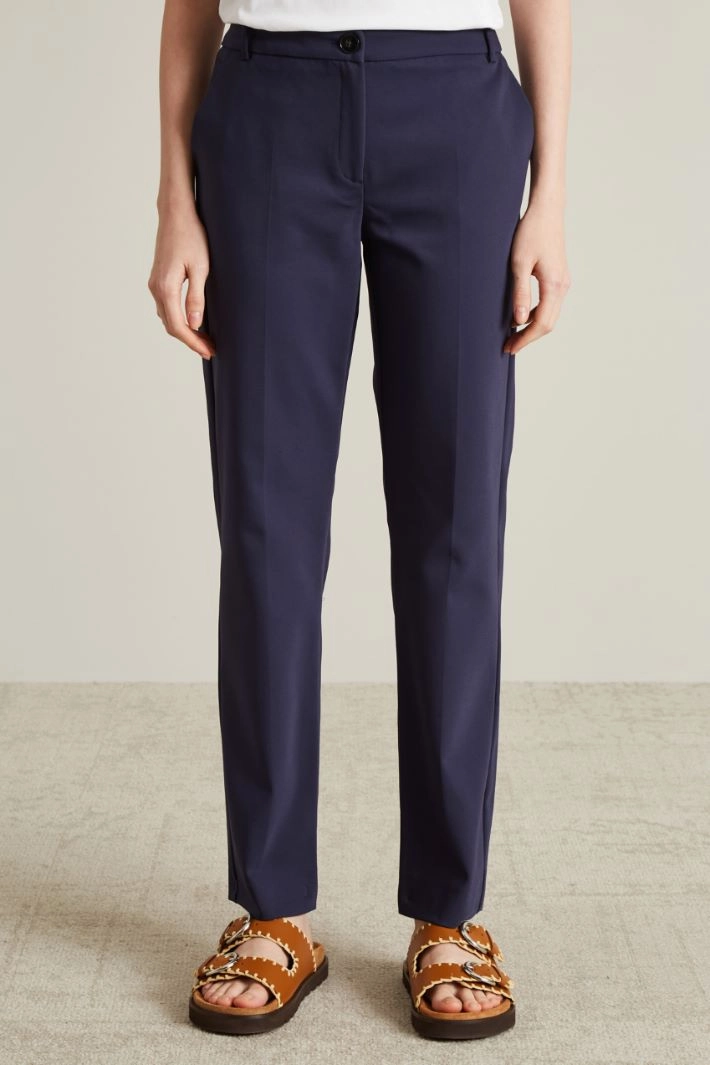 Cigarette trousers in stretch cotton blend fabric, with French side pockets, pressed crease and hidden fastening with hidden zip and button.