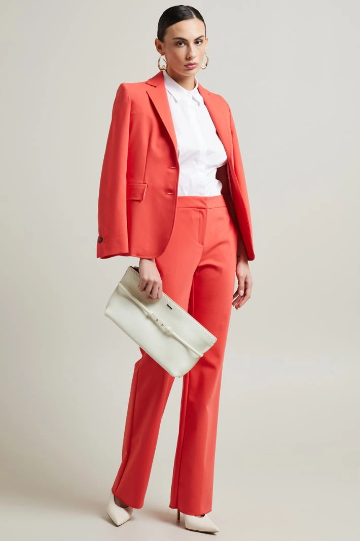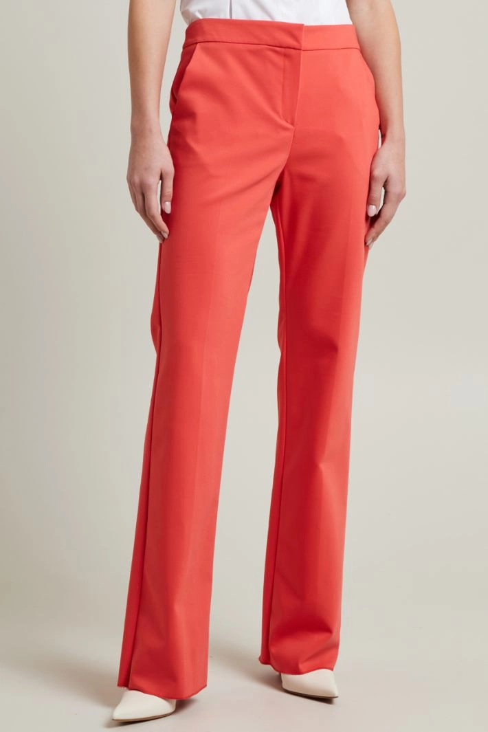 Straight-fit trousers in stretch cotton blend fabric, with French side pockets, pressed crease, hidden fastening with zip, button and hook.