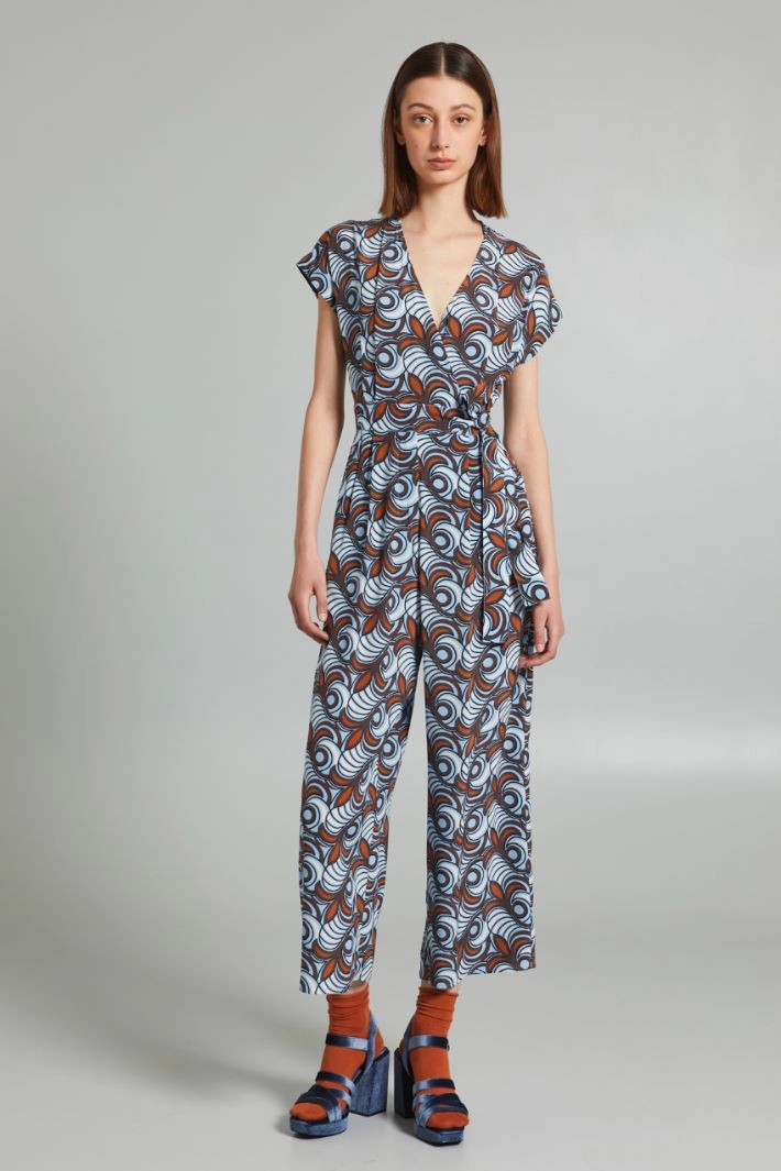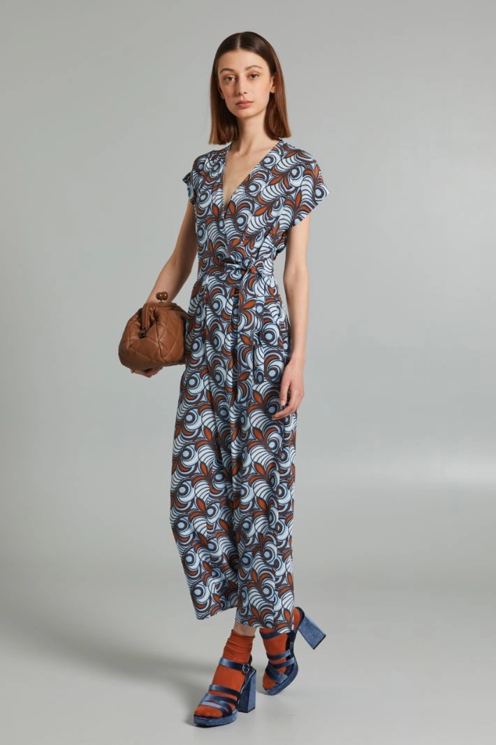 Fluid tracksuit in printed pure silk crepe de chine, with crossed V-neck, short kimono sleeves, belt at the waist and sash to tie on the side, side pockets inserted in the seams. Hidden zip fastening.