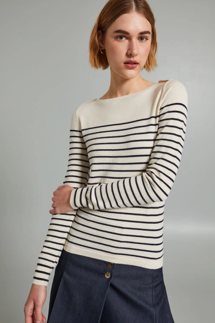 Regular fit stockinette stitched sweater in silk and wool yarn featuring a boat neckline and long sleeves.