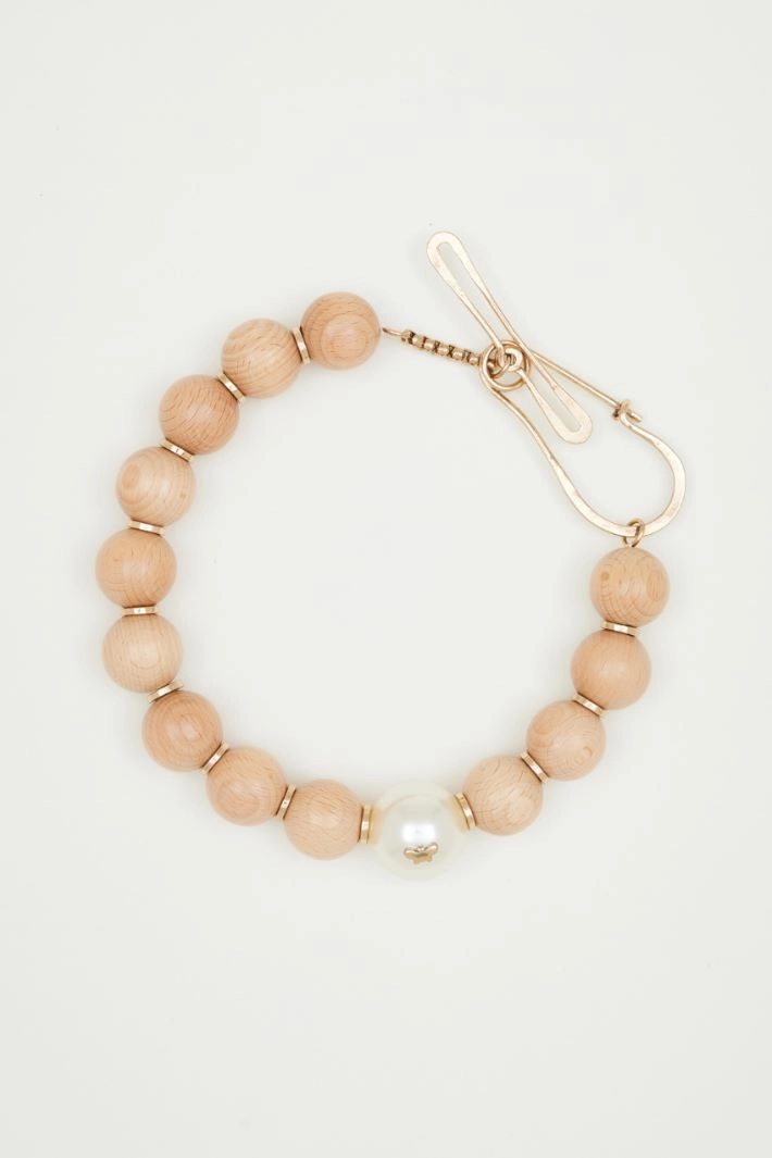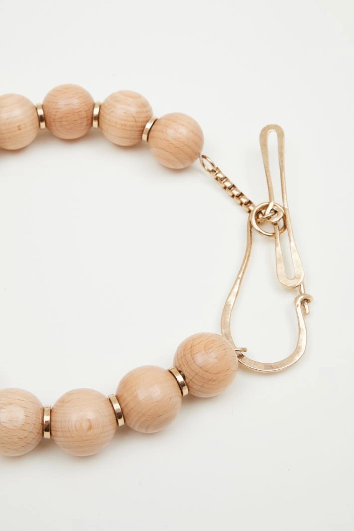 Choker featuring lacquered wood maxi boules, with metal and pearl-effect resin details. Fastening with a lobster clasp.