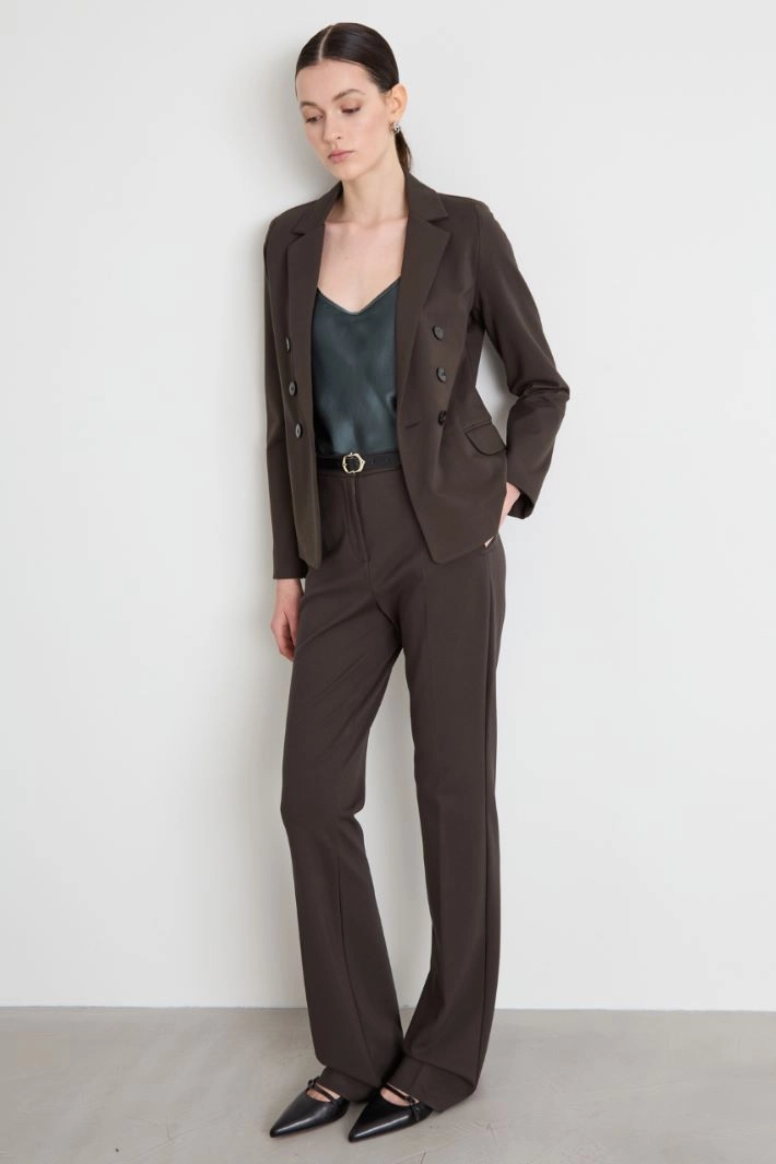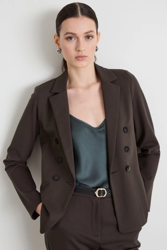 Fitted blazer in viscose blend jersey, with long sleeves, flap pockets and double-breasted button fastening.