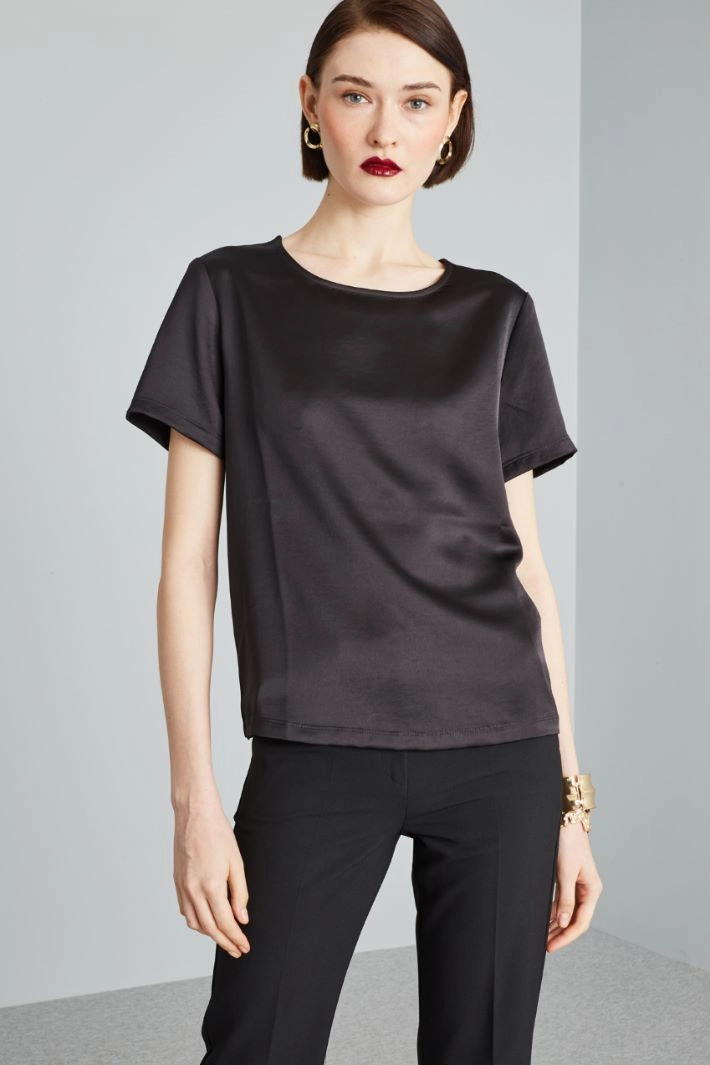 Straight-fit T-shirt in satin with stretch cotton blend jersey inserts, crew neck, short sleeves and teardrop opening with button on the back.