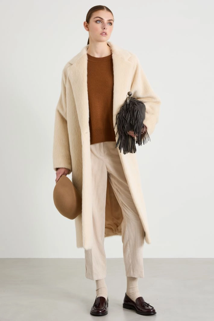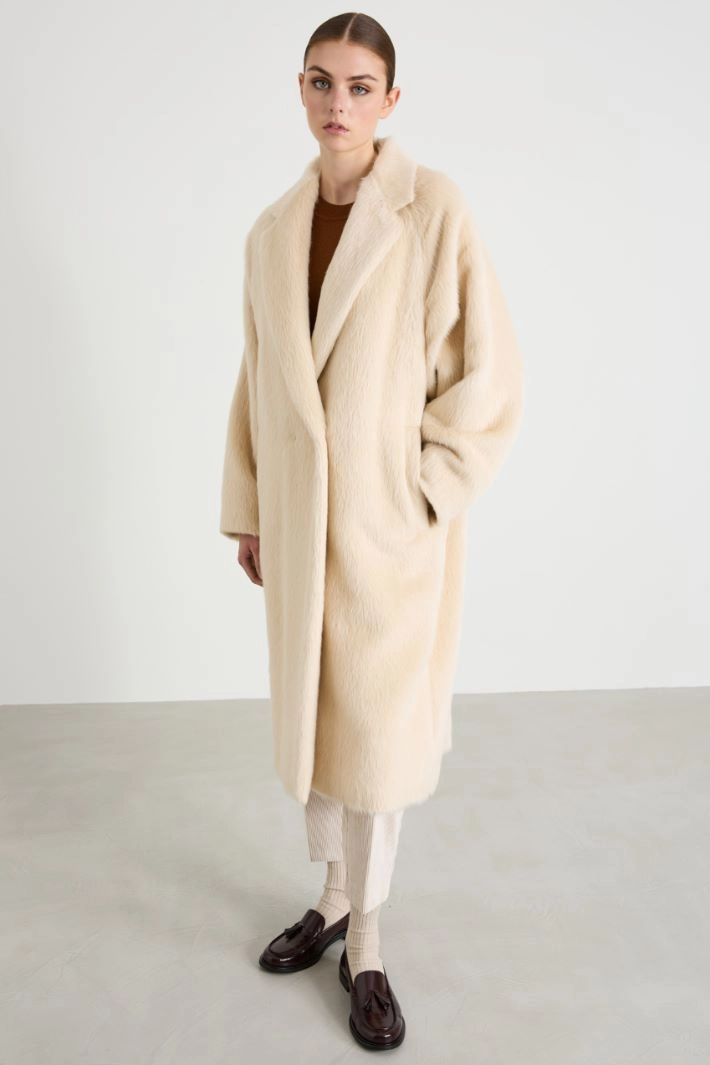 Long straight-fit coat in alpaca and wool fur-effect fabric, with lapel collar, long raglan sleeves and side welt pockets. Double-breasted button fastening. Lined.
