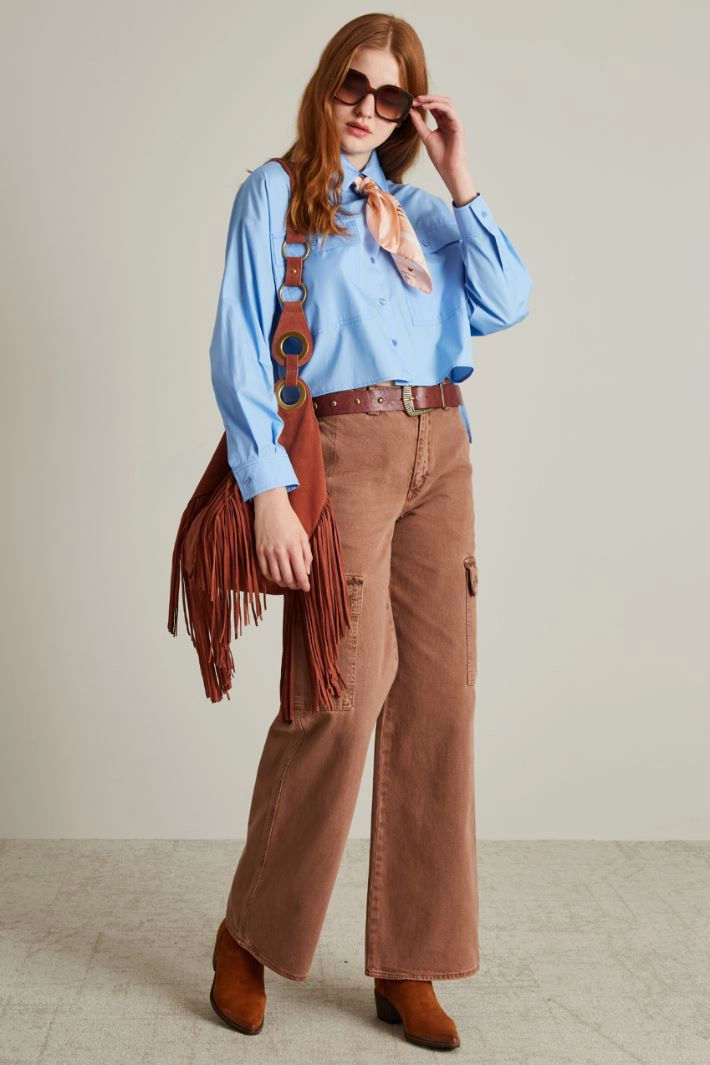 Oversized cargo trousers in pure cotton bull, with belt loops at the waist, inset side pockets, welt pockets on the back and applied with flap and buttons along the leg, hidden fastening with hidden zip and button.