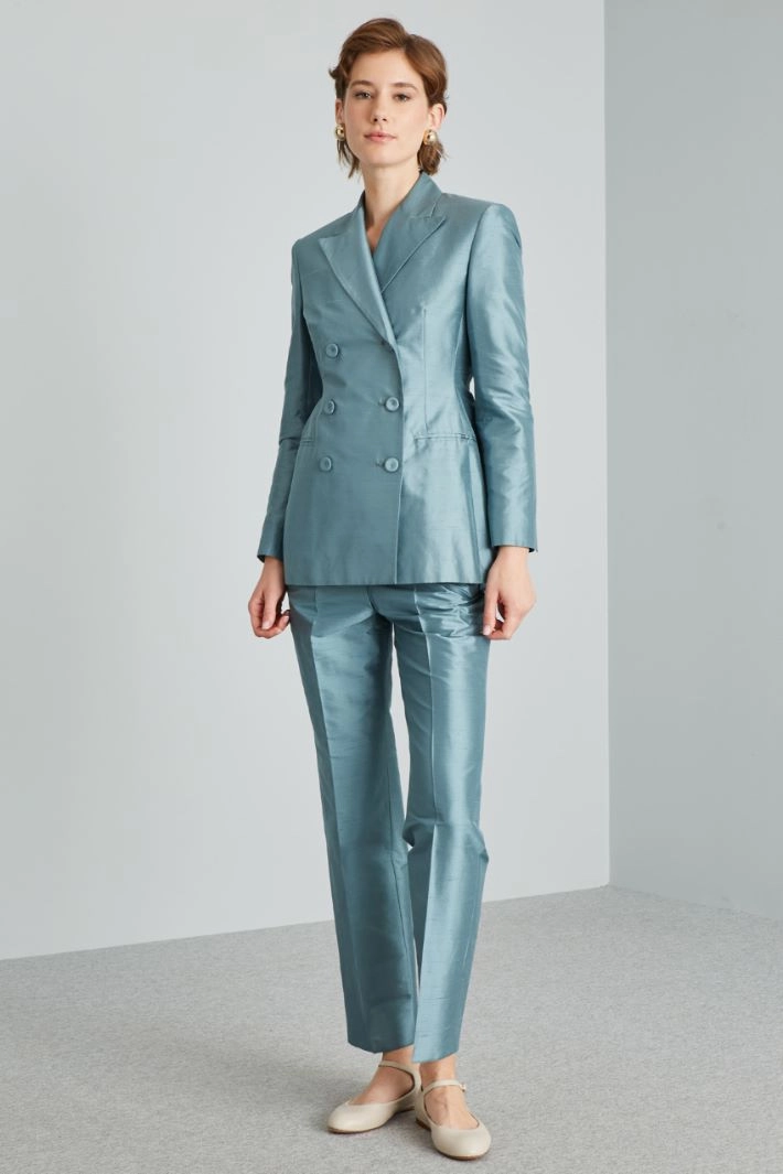Cigarette trousers in pure silk shantung, with French side pockets, crease pressed lengthwise and hidden fastening with zip, button and hook.