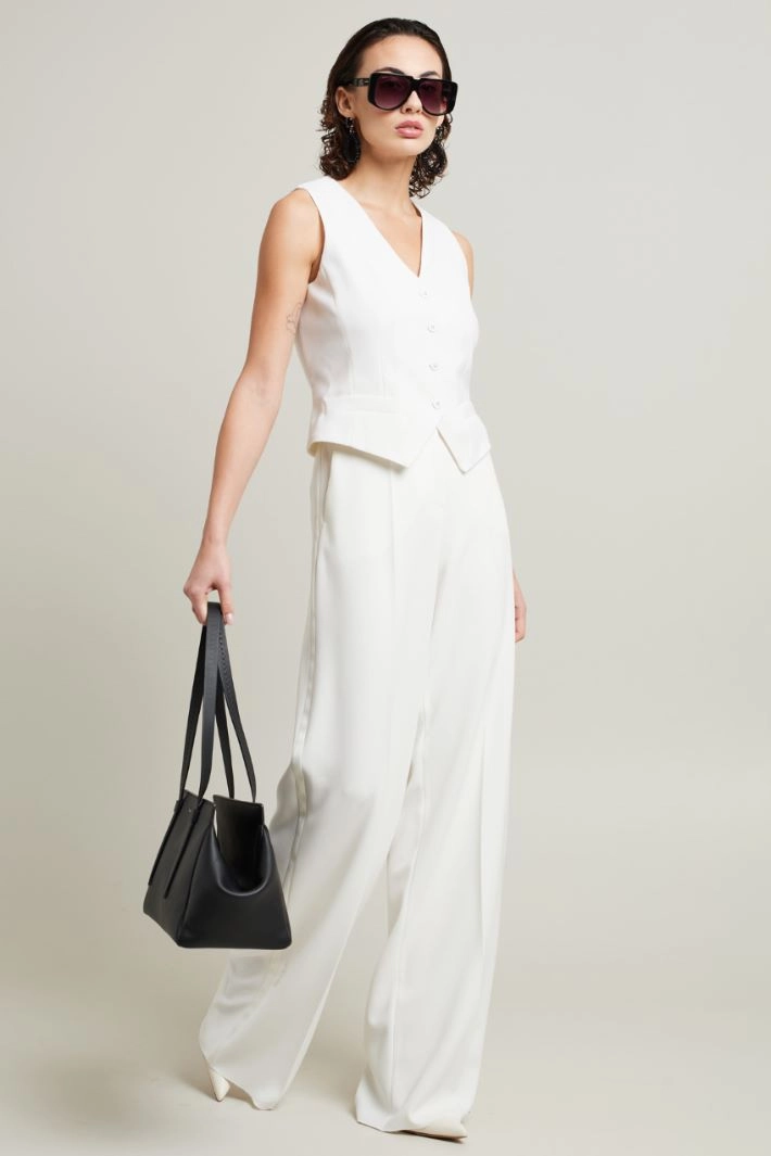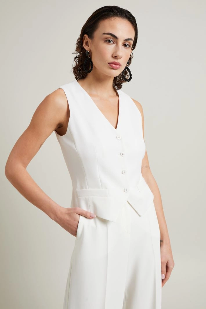 Fitted gilet in pure wool crepe, with V-neck, sleeveless, side welt pockets, adjustable strap on the back and single-breasted fastening with buttons. Lined.